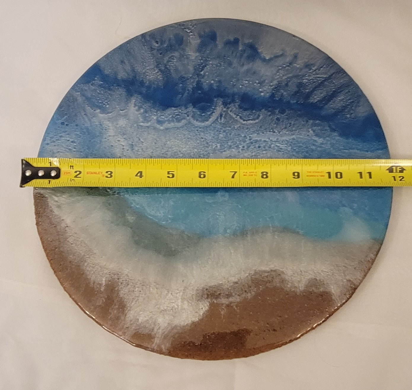 Bring home a little piece of the ocean today with this 12” round resin beach art 3/4 of an inch thick. This piece features a textured beach made with sand and epoxy resin mixture with layers of frothy resin waves. Mounting hardware is an attached saw tooth hanger. Perfect for the beach lover in your life!