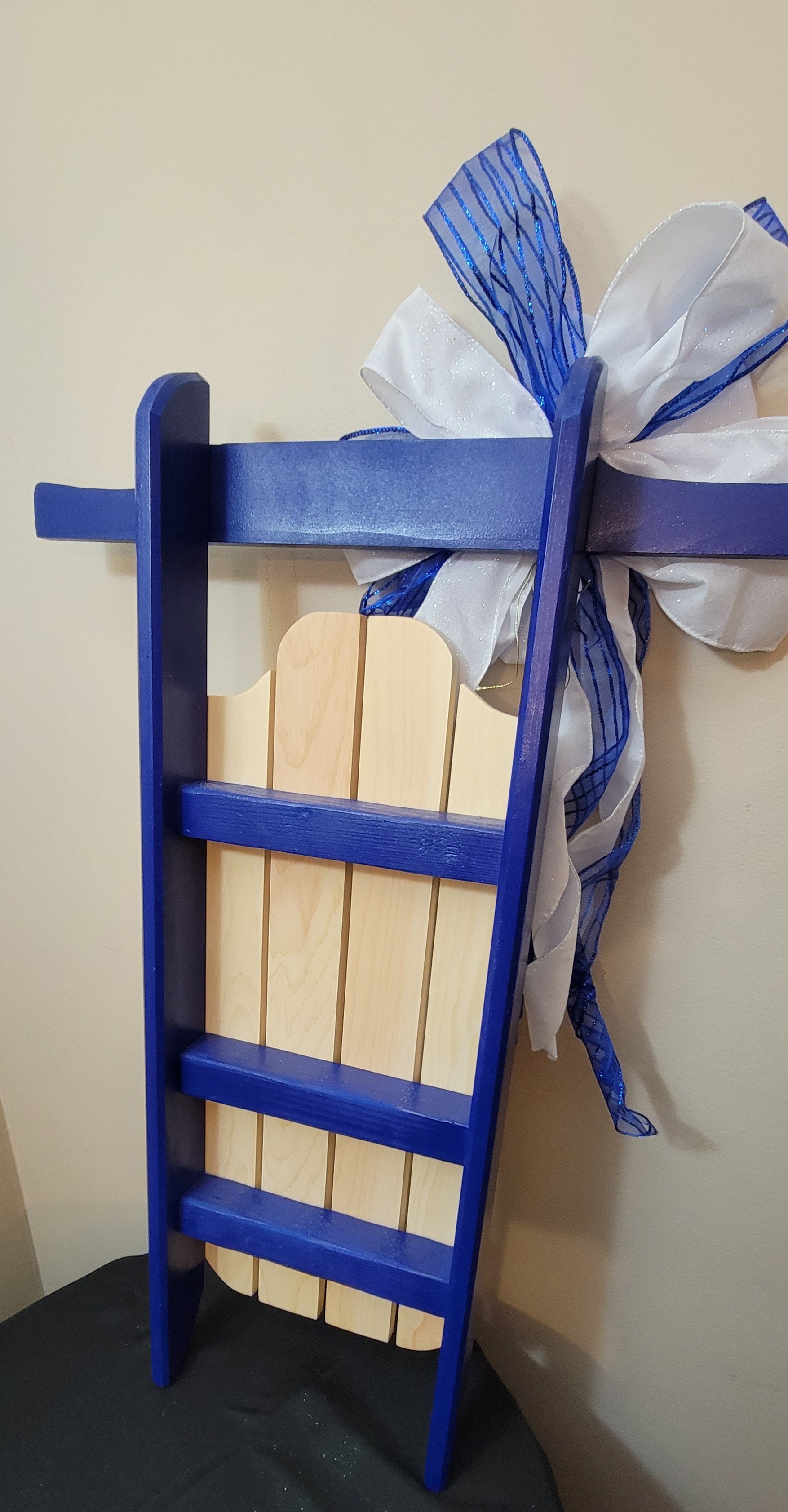 Adorning the sled is a hand-made bow, a captivating blend of frosted white and sheer wired royal blue ribbon. This exquisite bow is not just an accessory; it's a symbol of the holiday season's joy and elegance, giving the sled an opulent and festive appearance.
