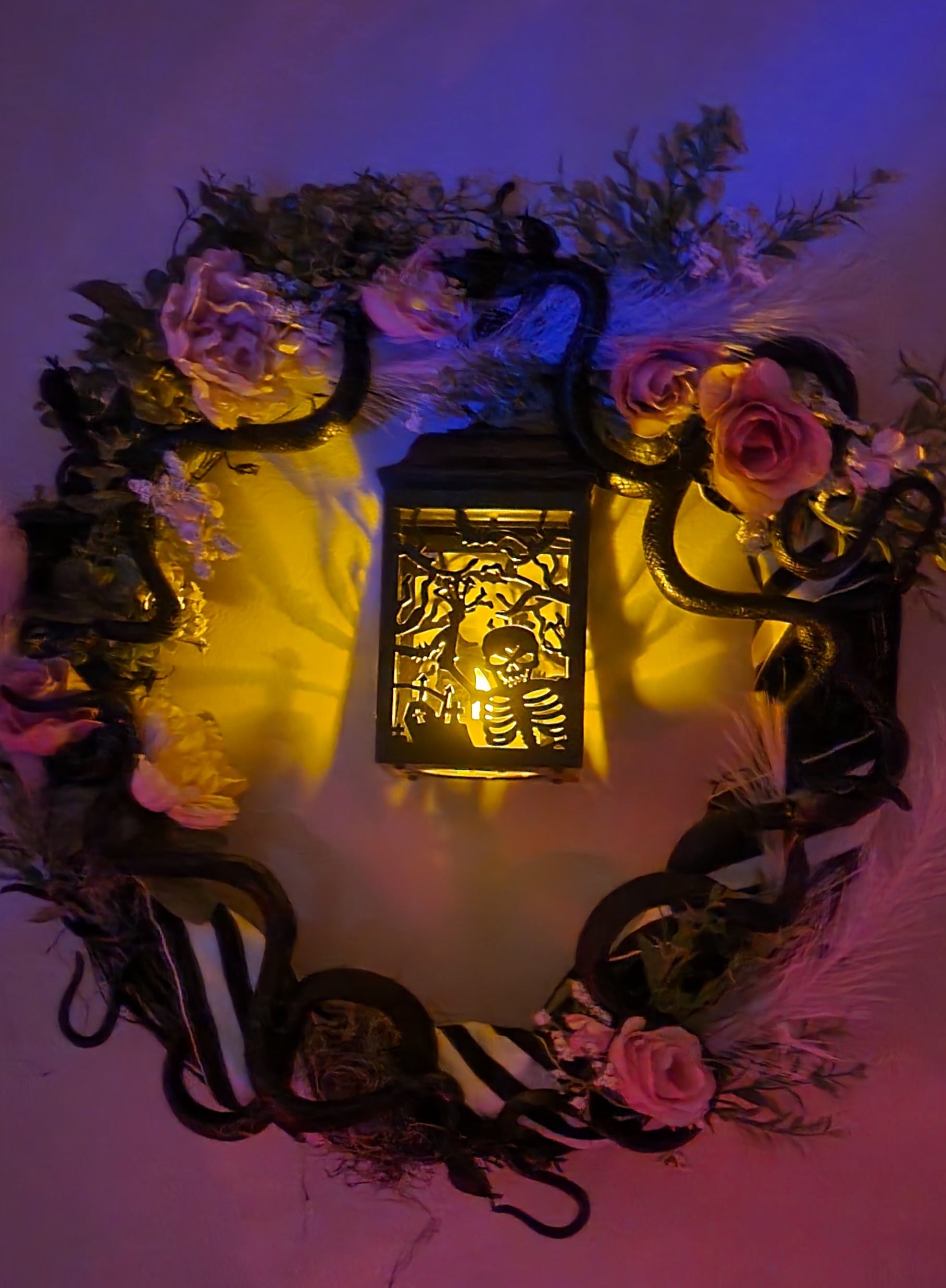 Crafted from high-quality grapevine and adorned with snakes, black and white striped ribbon, a glowing lantern and beautiful artificial flowers and greenery, this wreath is a true work of art. The snakes add a touch of mystery and enchantment, while the black and white striped ribbon and glowing lantern provide a spooky and mysterious touch. The artificial flowers and greenery provide a delicate and feminine touch.