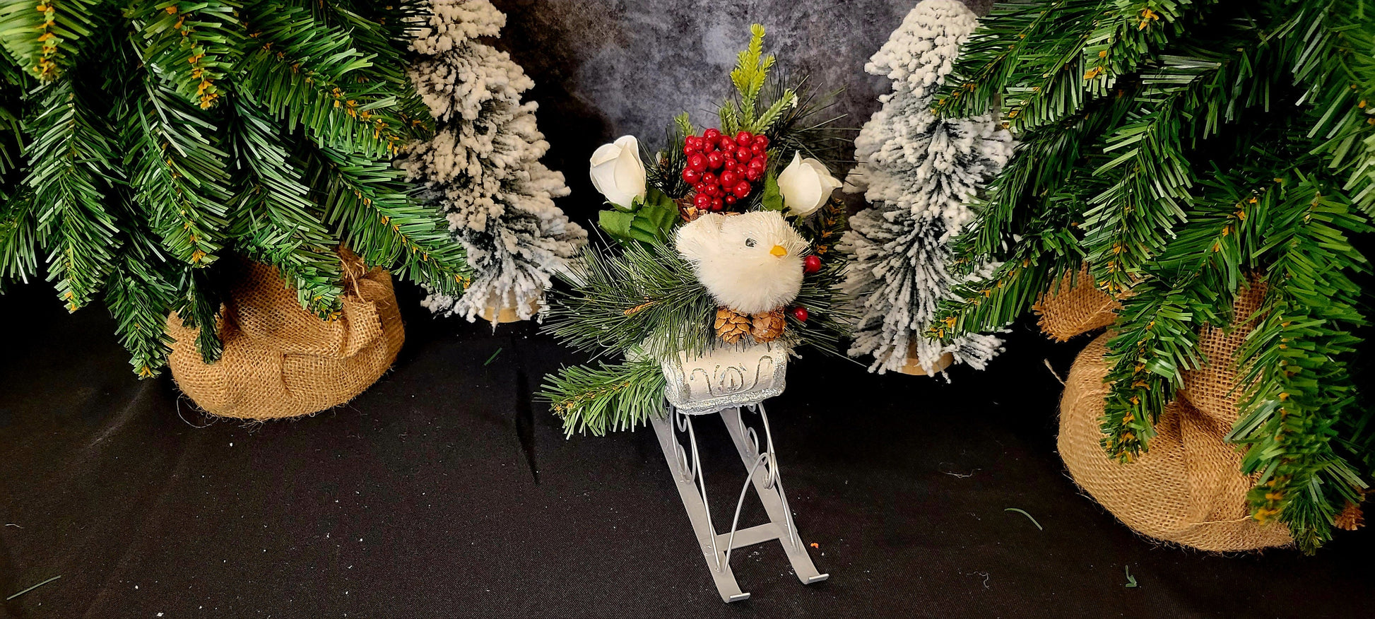 Elevate your holiday decor with our Winter Elegance Chickadee Sleigh Display, a perfect blend of glitter, florals, and a charming chickadee.