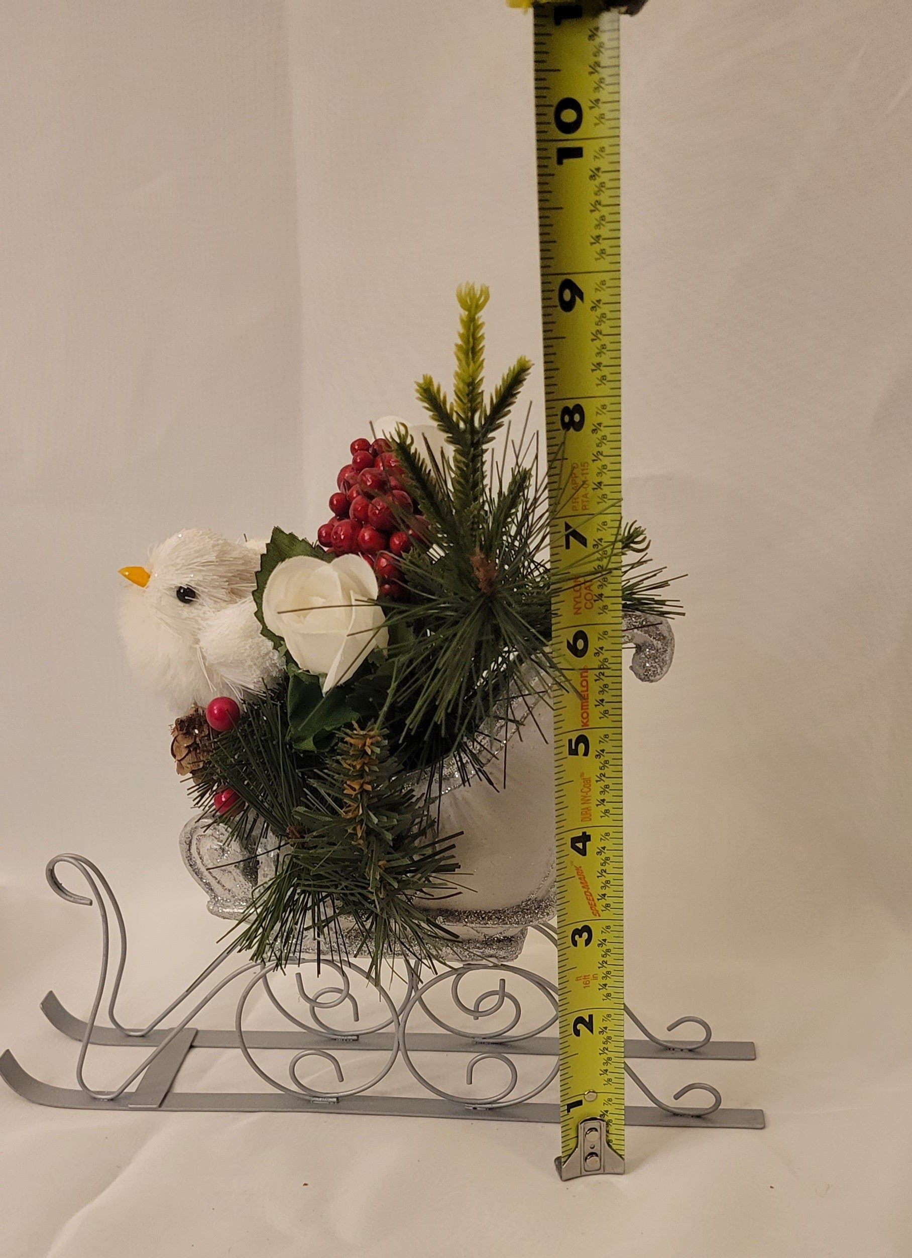 Within this dazzling sleigh is an arrangement that speaks of winter's natural elegance. Artificial greenery and winter florals lay the foundation, creating a lush and verdant backdrop. Nestled amongst these are pristine white roses, their beauty and purity echoing the tranquil calm of a winter's day. But the true centerpiece of this arrangement is the beautifully crafted white chickadee, perched gracefully, adding a touch of lifelike charm and whimsy.
