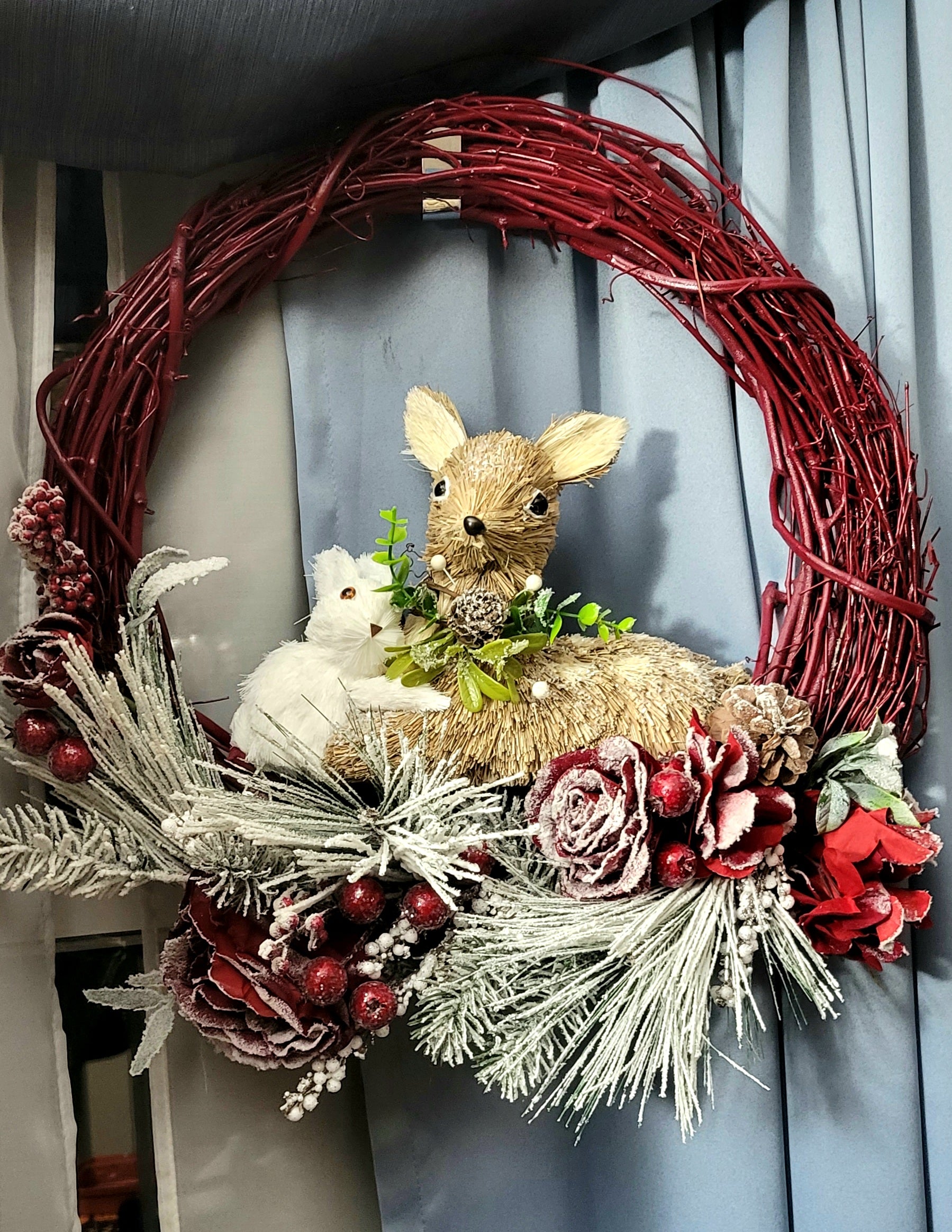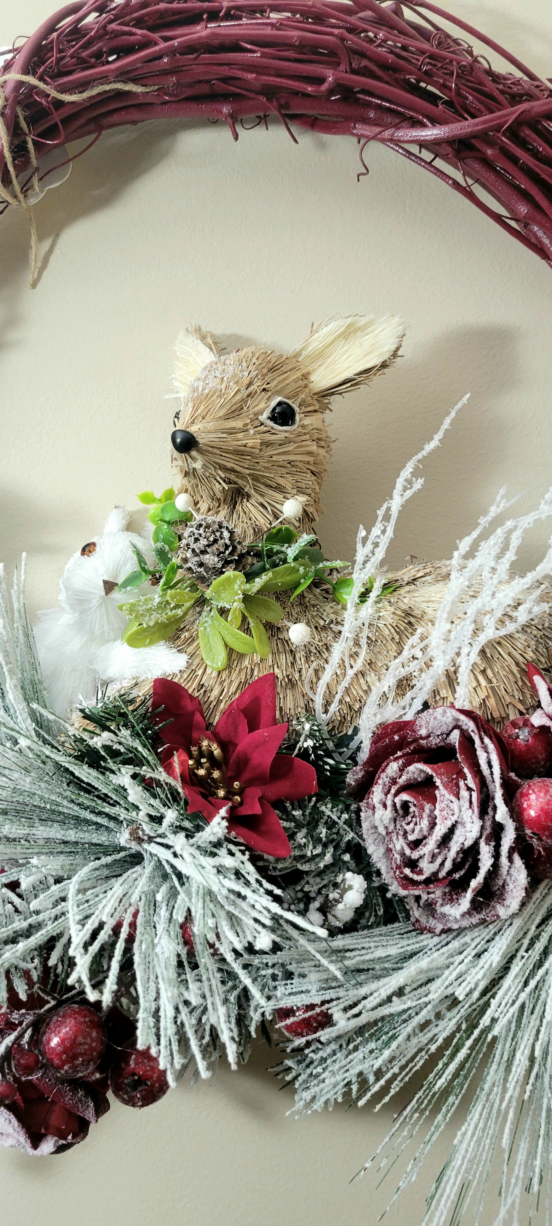Welcome to Nightshadenook.com, where we bring the magic of a winter forest to your doorstep with our "Cranberry Forest Friends Wreath." This isn't just a wreath; it's a window into a charming winter tale, where nature's beauty meets festive cheer.