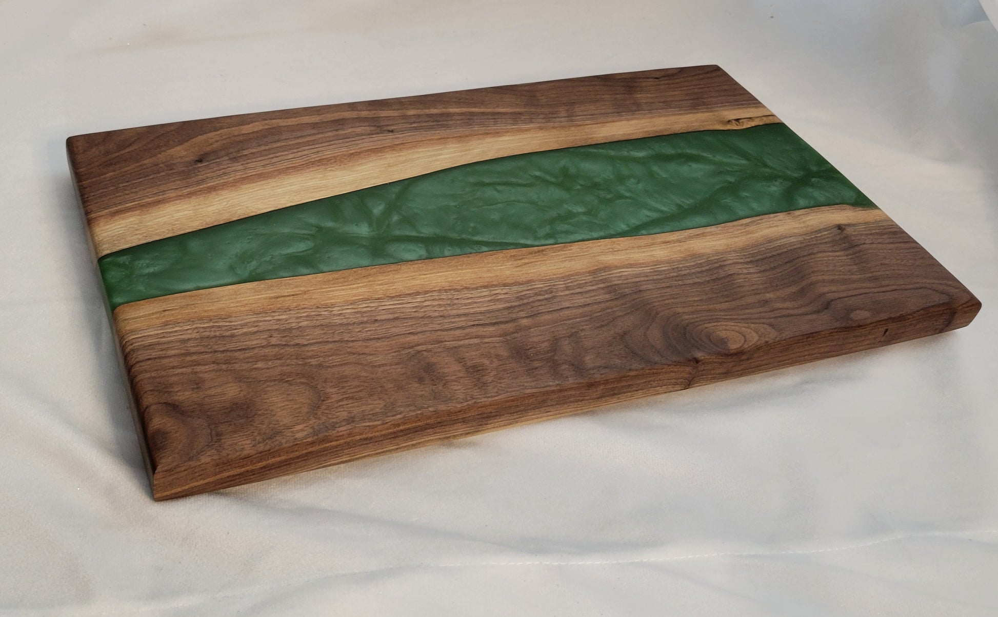 Handmade from black walnut wood with a deep green epoxy resin river
