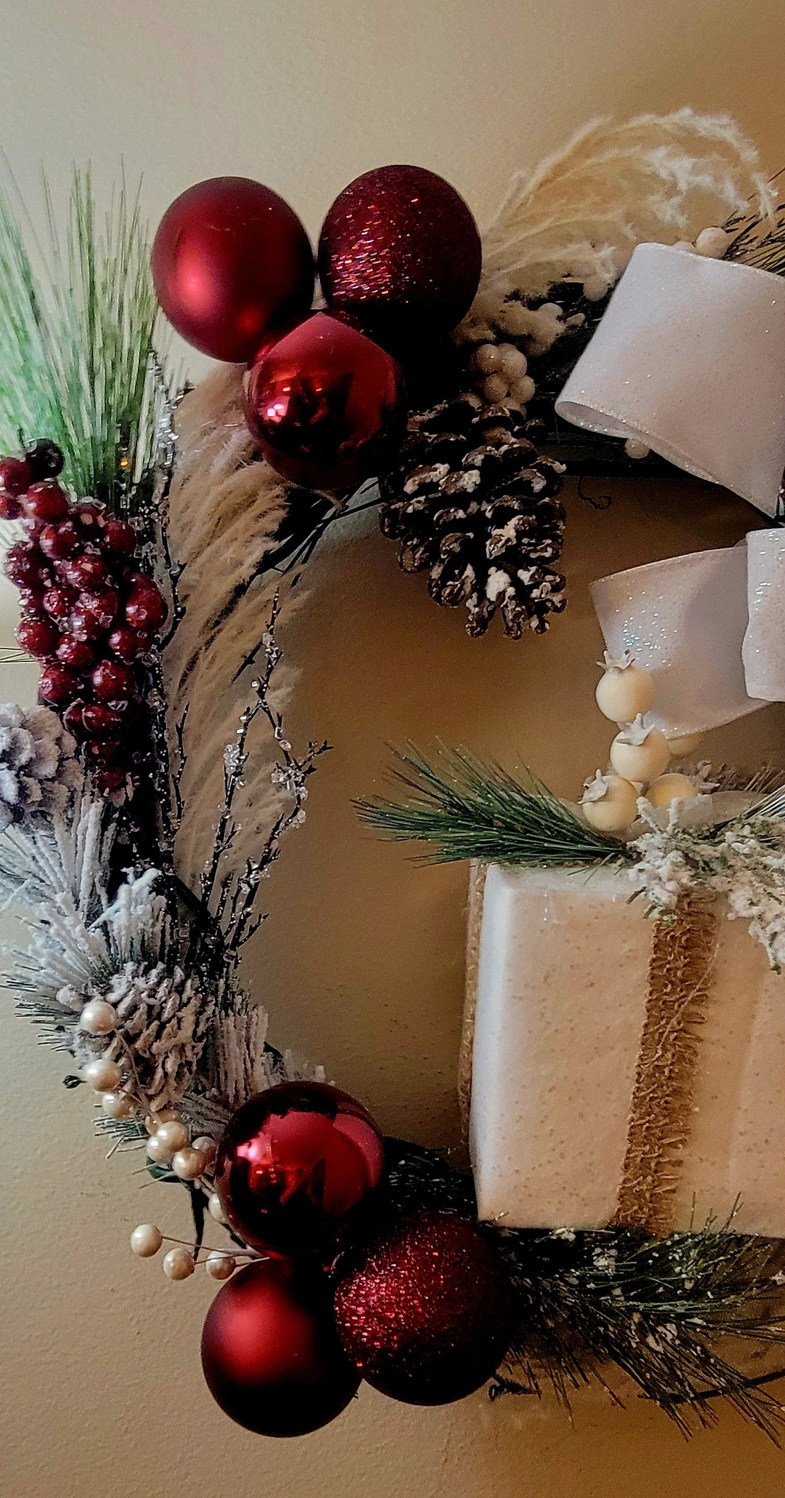 Built on an 18-inch grapevine base painted in rich evergreen, this handcrafted wreath is dressed in pine greenery, frosted pinecones, and deep red ornaments that bring warmth to the cool tones of the season. A white and holly-patterned bow adds graceful contrast, while a small white gift box tied in gold rests at its heart — a reminder of the simple joys that make the holidays meaningful.