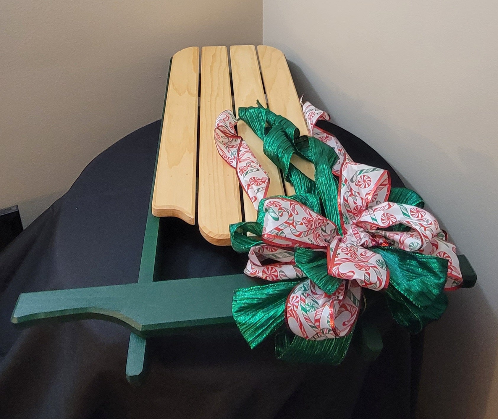 The hand-made bow is a stunning combination of a fun peppermint and candy cane ribbon with a shimmering Christmas green ribbon, to give this sled that over-the-top look.