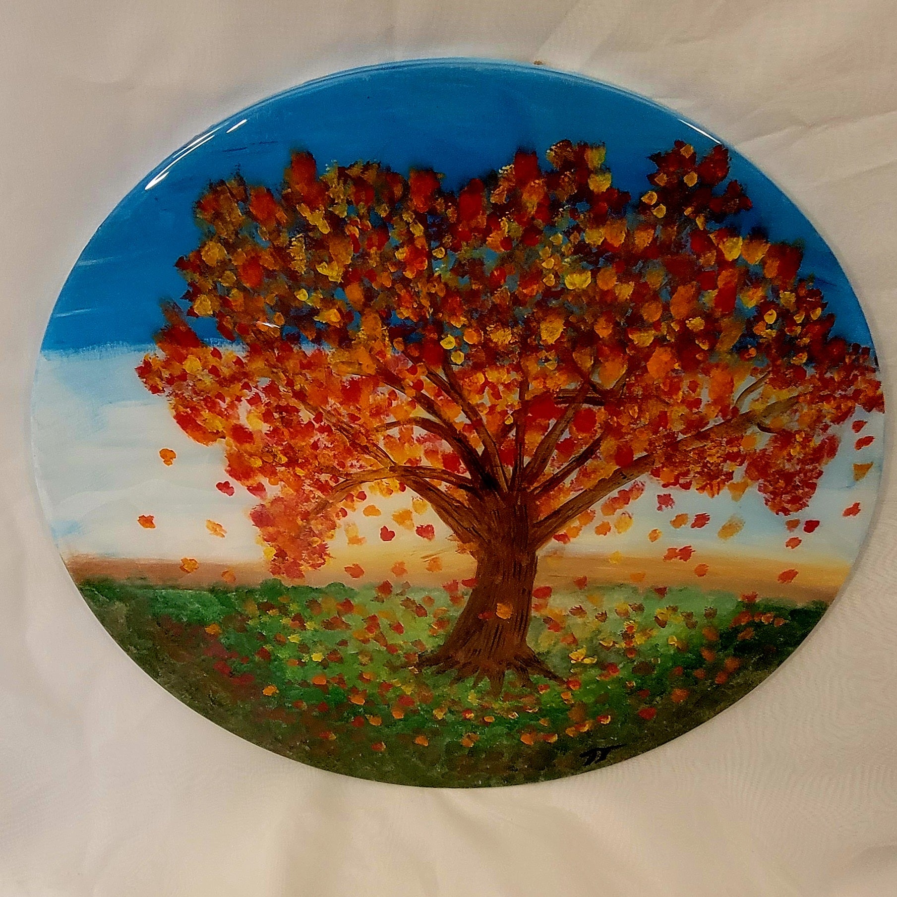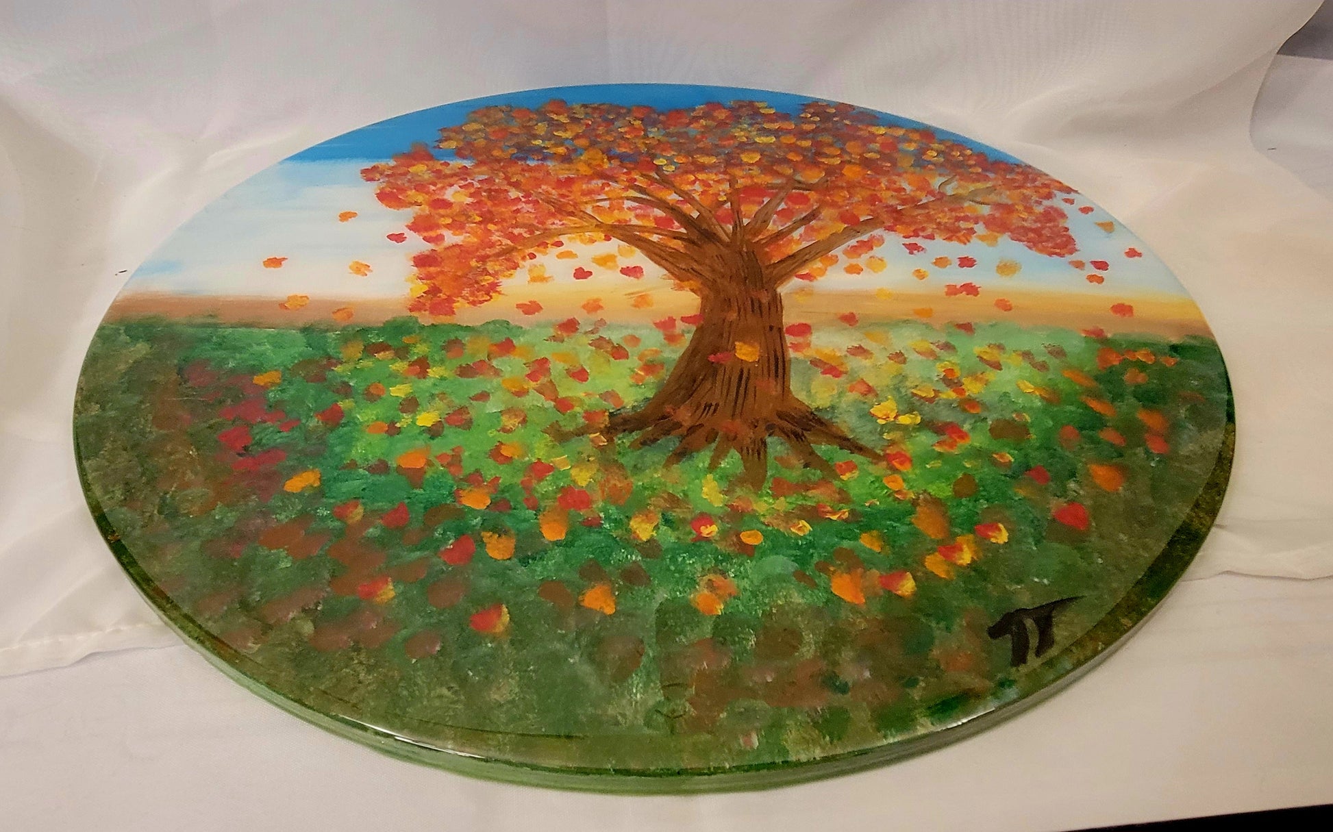**Design:** Handpainted vibrant fall tree with gently falling leaves \n- **Finish:** Glossy, due to the table-top epoxy resin coating