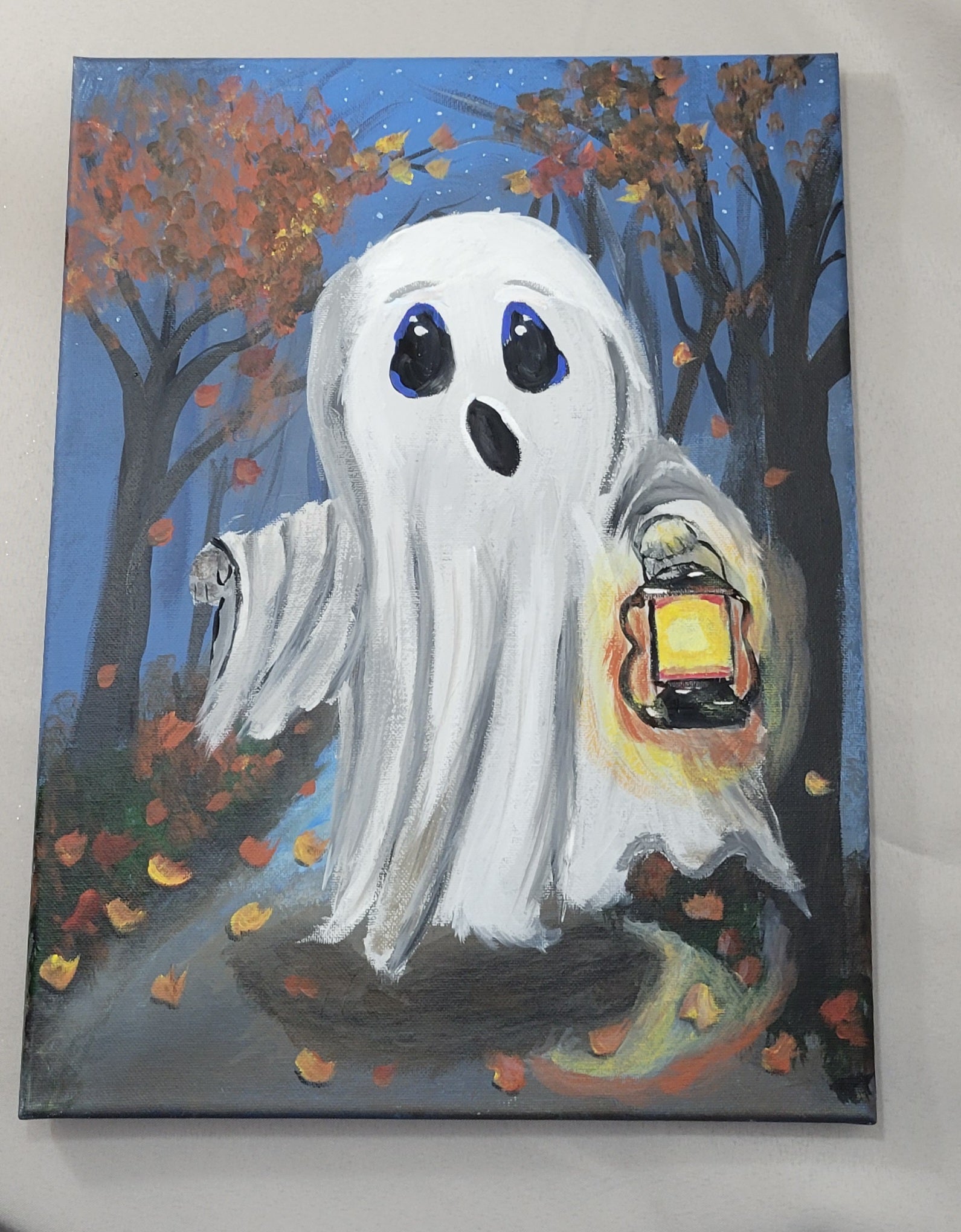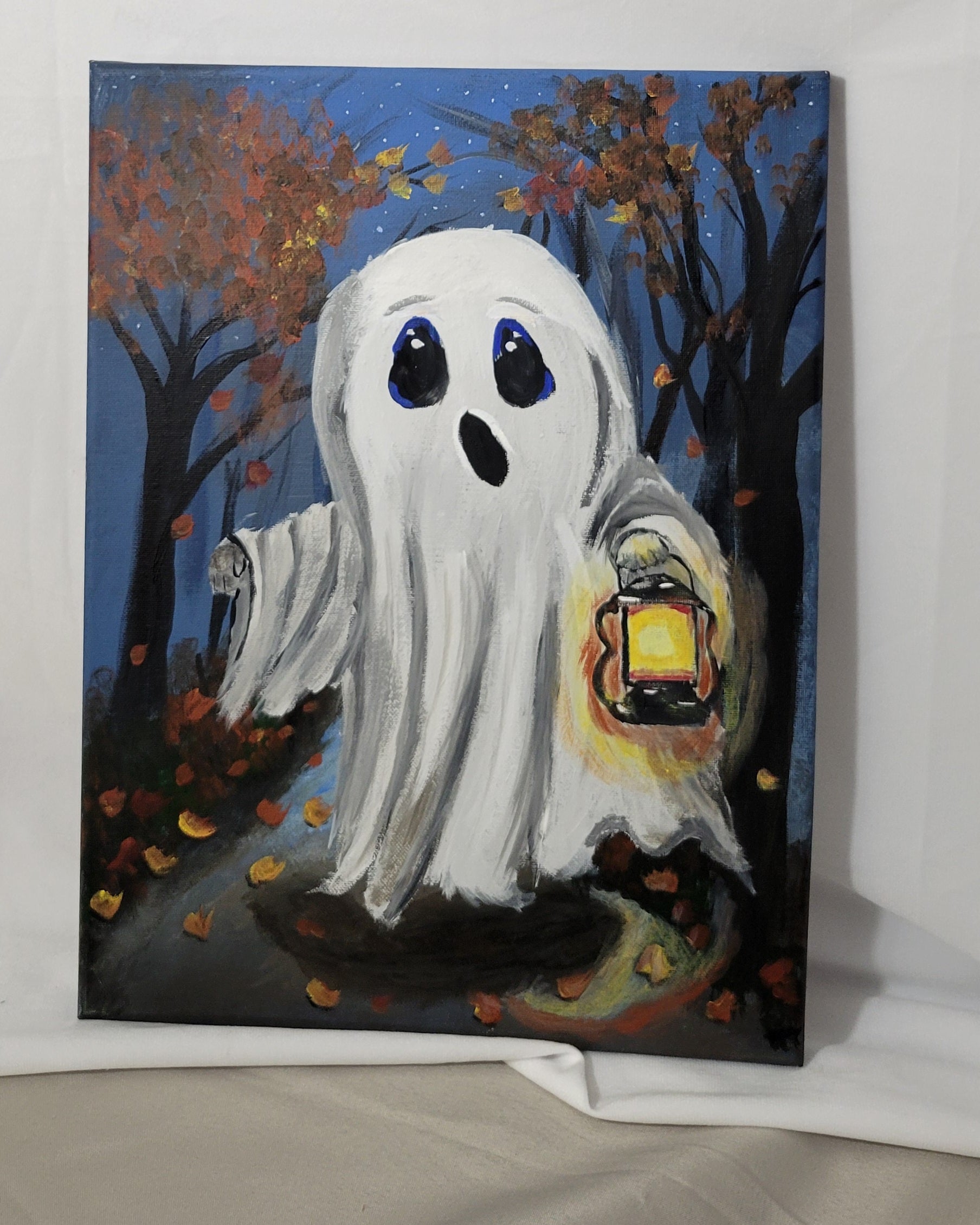 Let your fall décor take a turn toward the delightfully ghostly with this charming hand-painted canvas by Niki. Lantern Lit Boo – A Hauntingly Cozy Night is what happens when Halloween meets hygge. Picture it: a sweet little ghost with wide, curious eyes, wandering through a leaf-littered forest trail, lantern in hand, lighting the way beneath a twilight sky. This spirited scene is the perfect blend of spooky and snug—ideal for anyone who counts October as their aesthetic era.