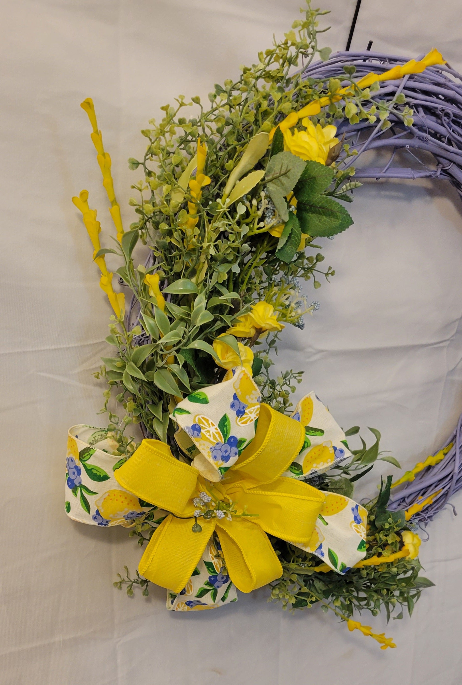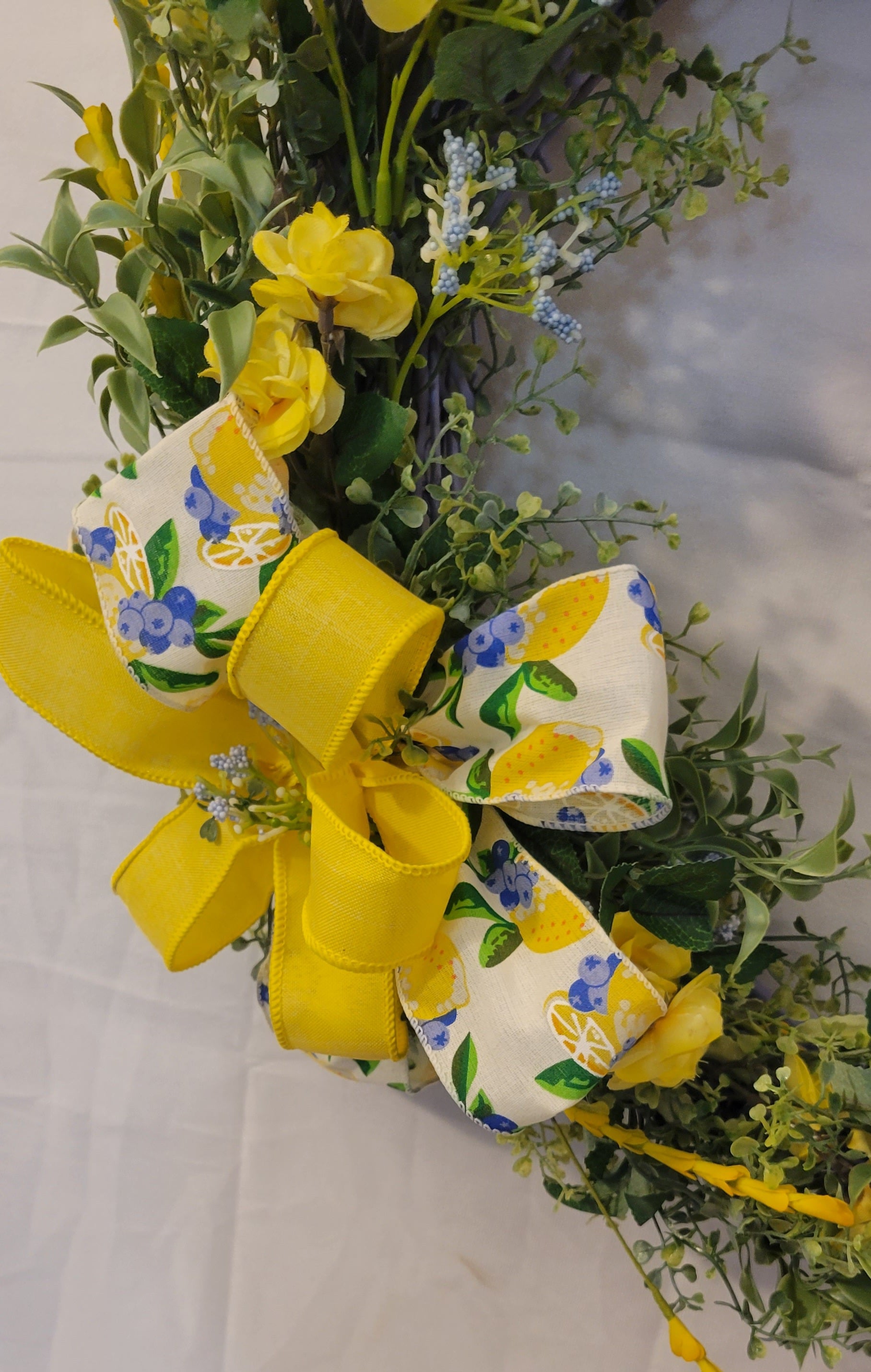 Handmade Bows: At the top of the wreath, you'll find two handmade bows, expertly crafted with attention to detail. The bows feature charming yellow and lemon, and blue print, perfectly accentuating the overall design and adding a touch of sophistication.