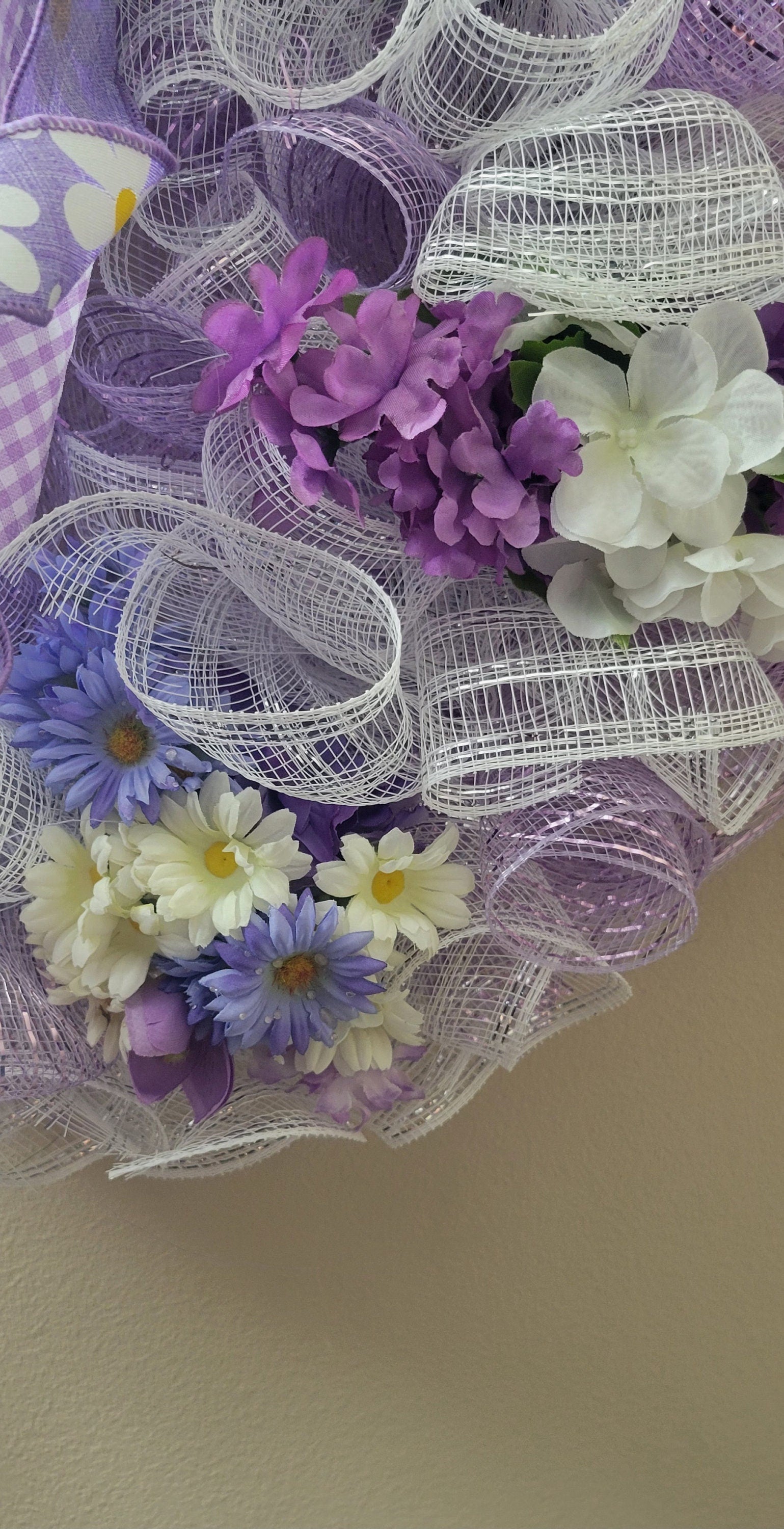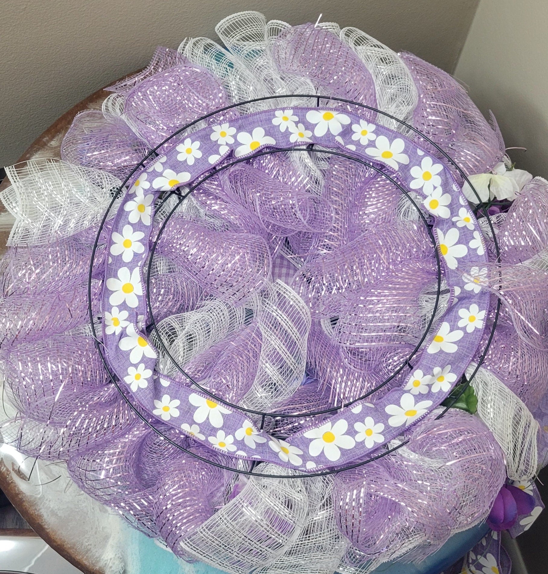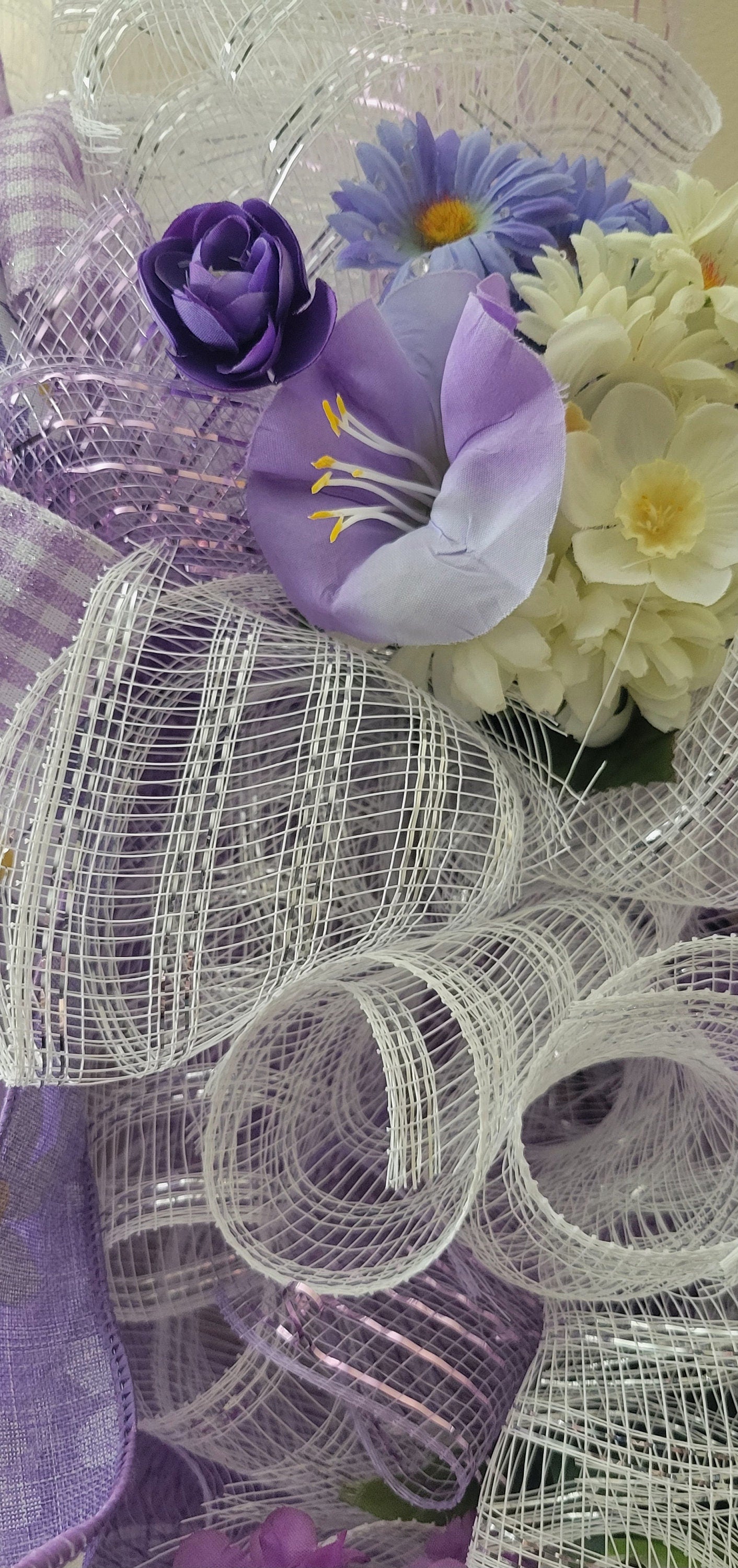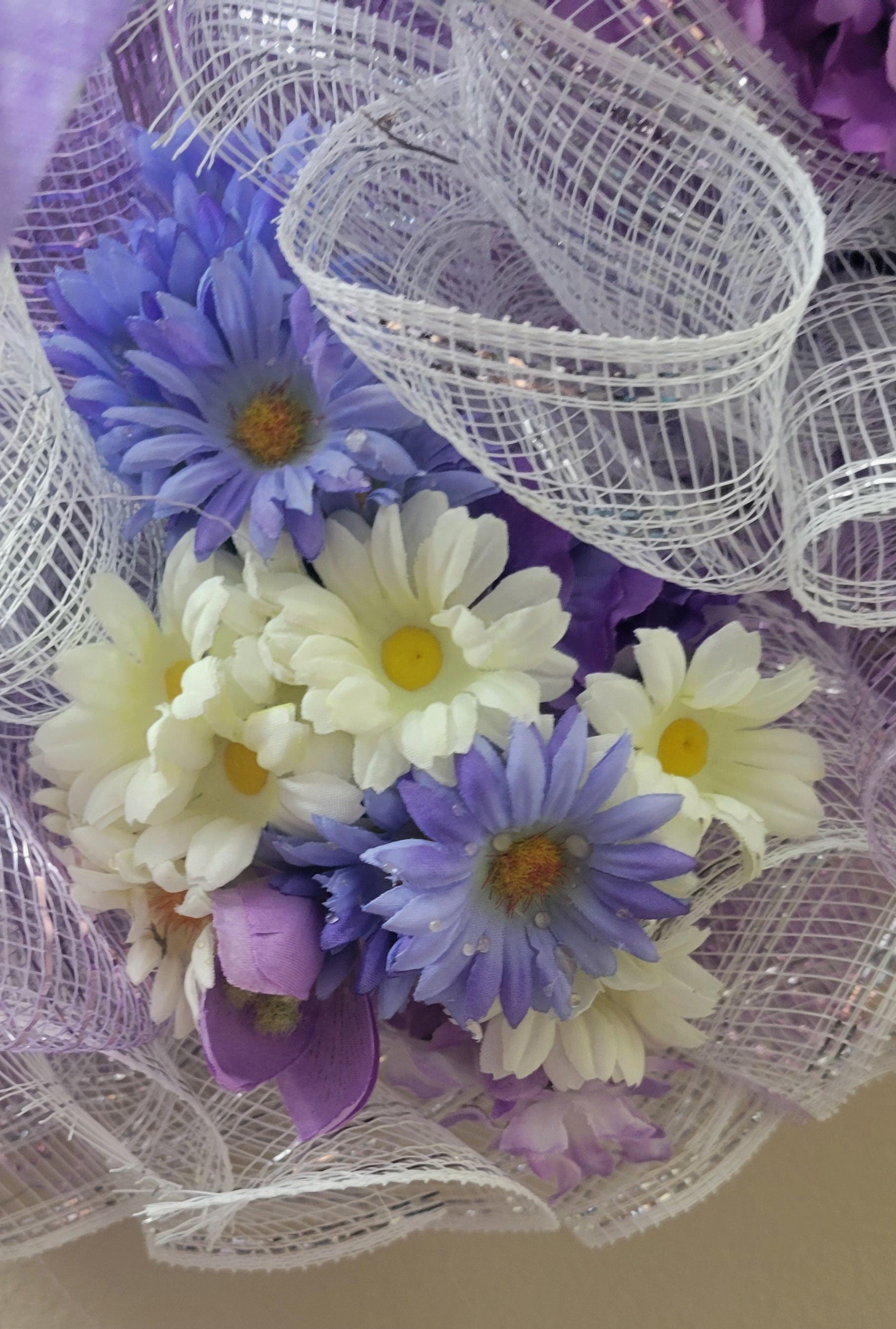 Stunning Eyelash Deco Mesh: The wreath is adorned with a combination of white and purple eyelash deco mesh, creating a texture that's both eye-catching and sophisticated. The blend of colors adds depth and visual interest to the wreath.