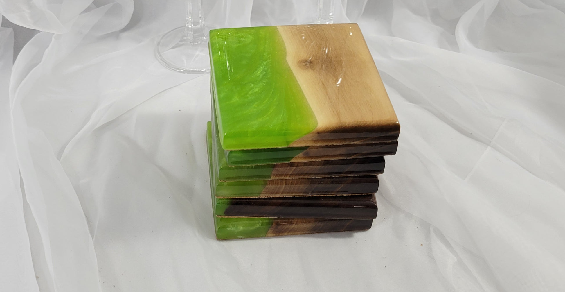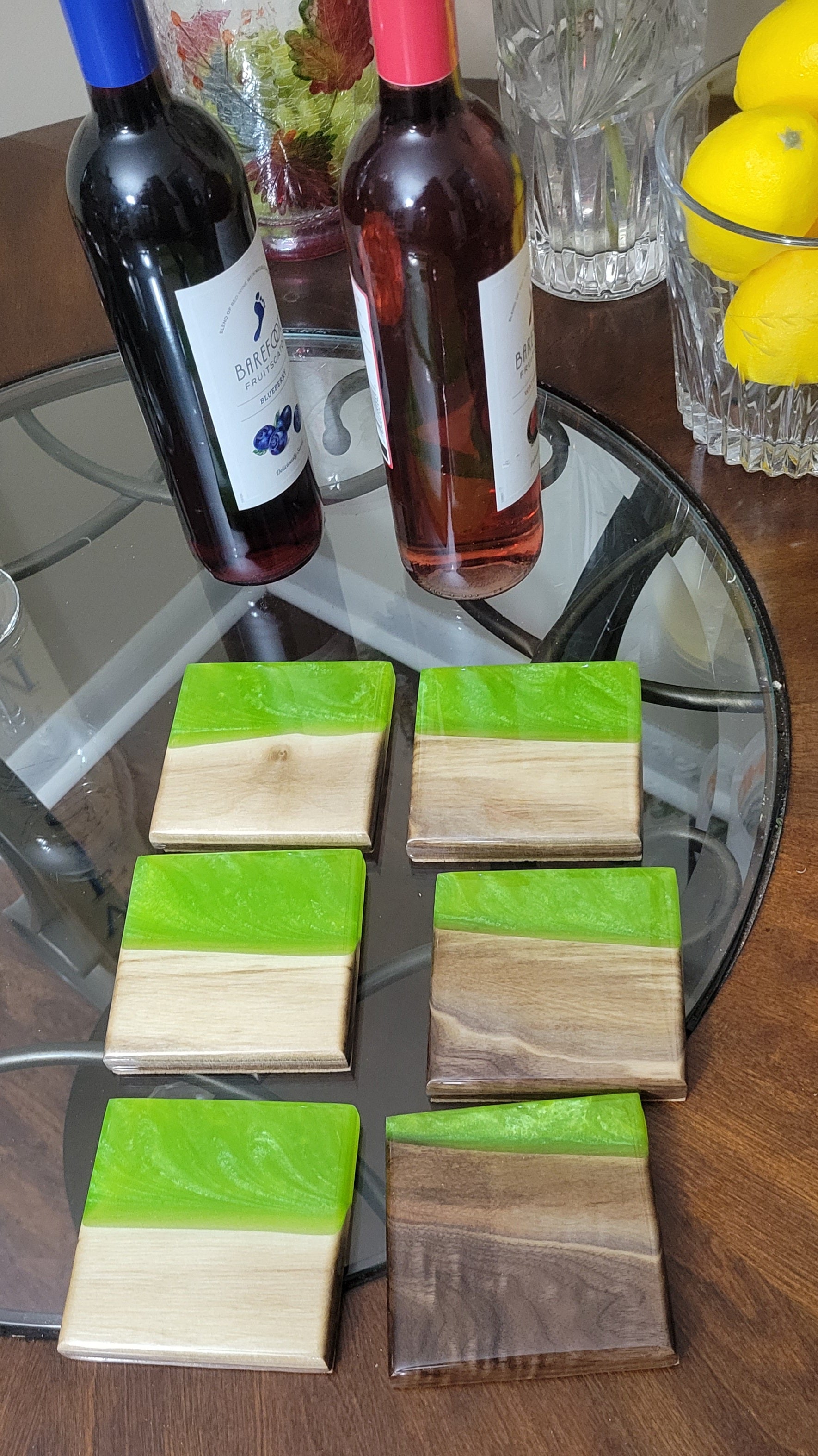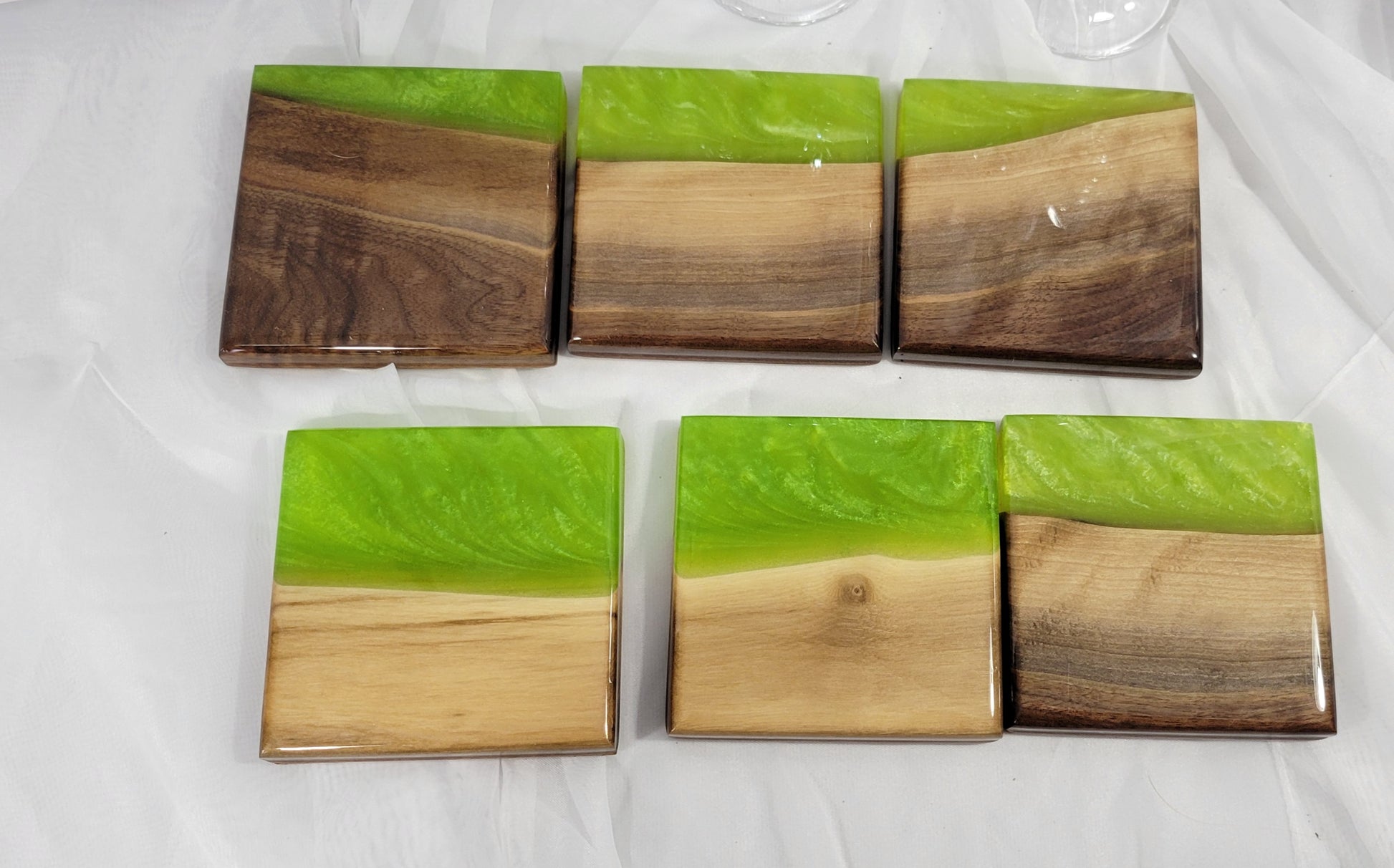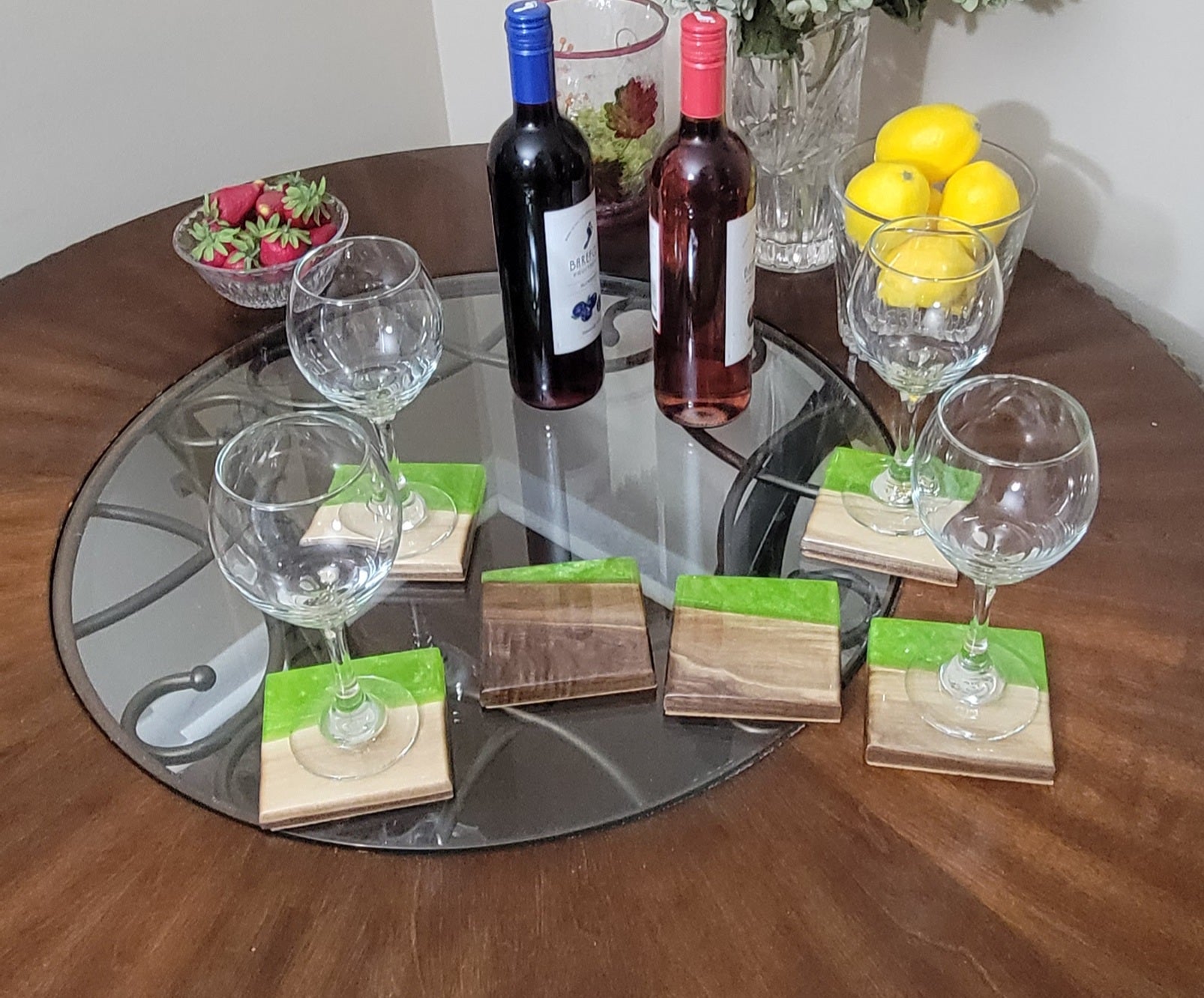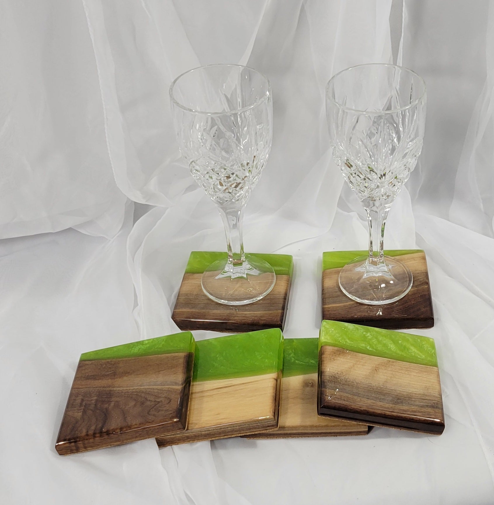 Bring a touch of artisanal charm to your home with our Lime & Pearl Swirl Black Walnut Coaster Set. Handcrafted with precision and care, each coaster is a work of art, featuring a unique epoxy resin river in lime and pearl swirls that adds a pop of color and sophistication to any surface.
