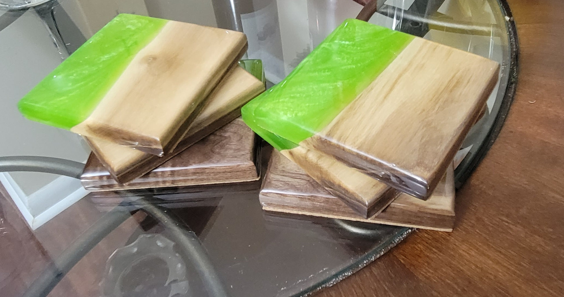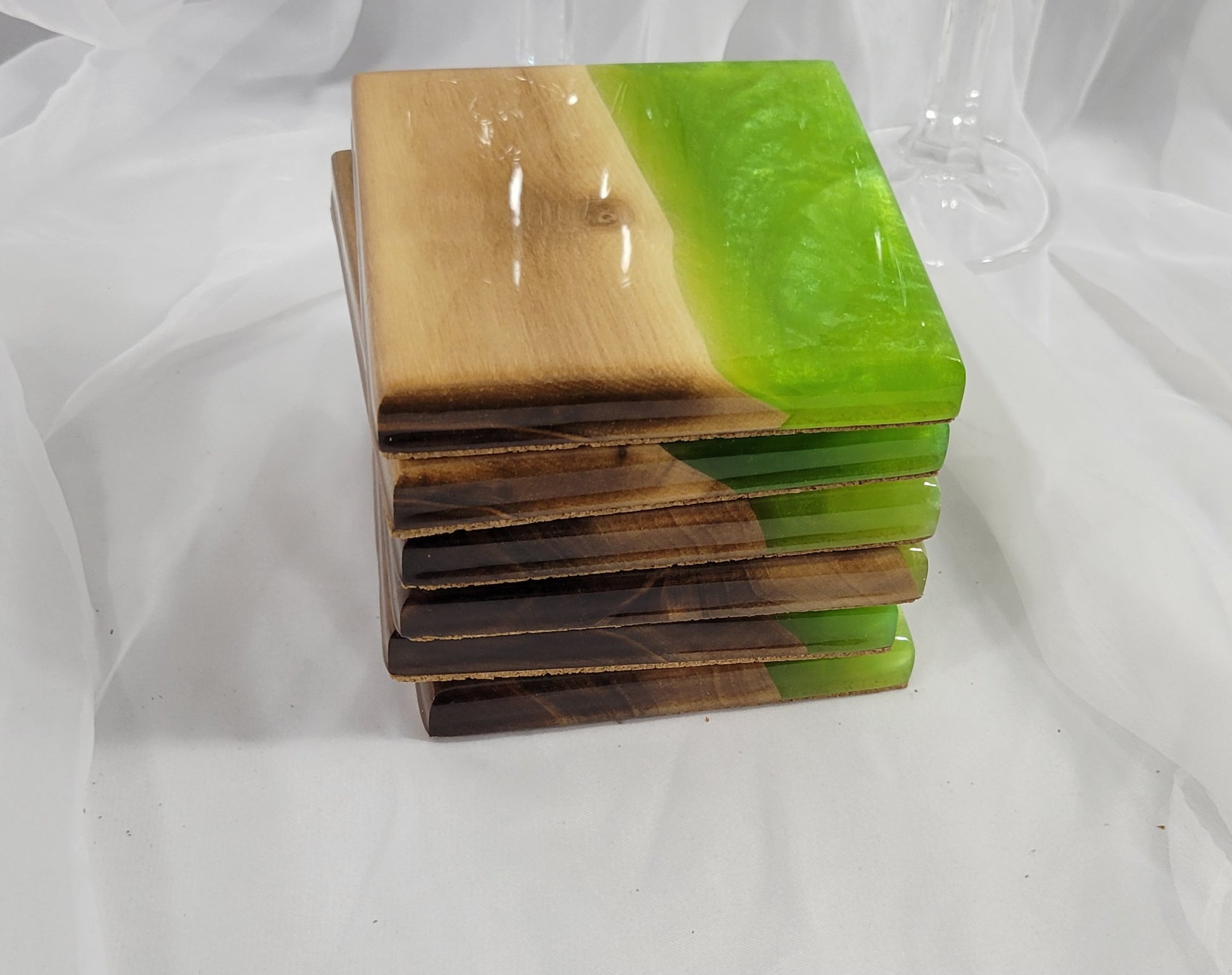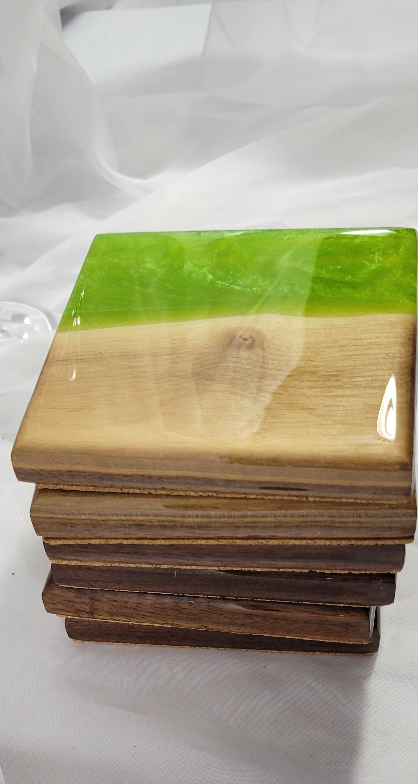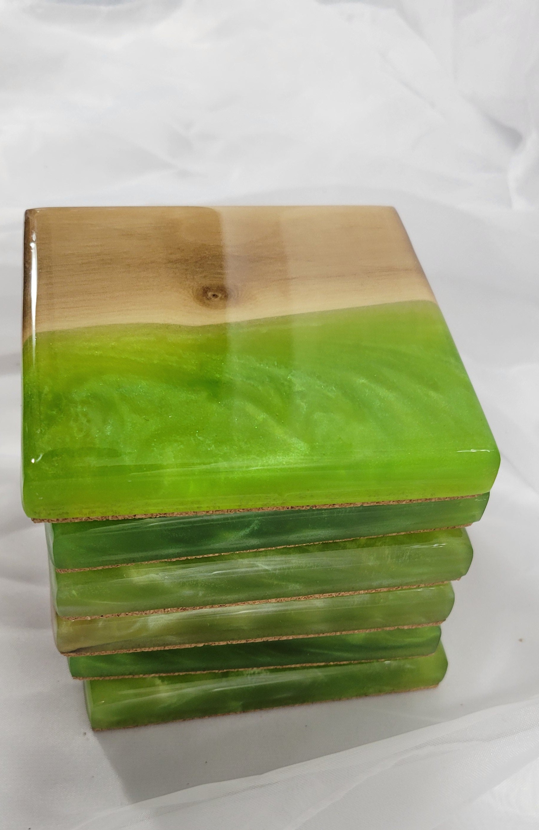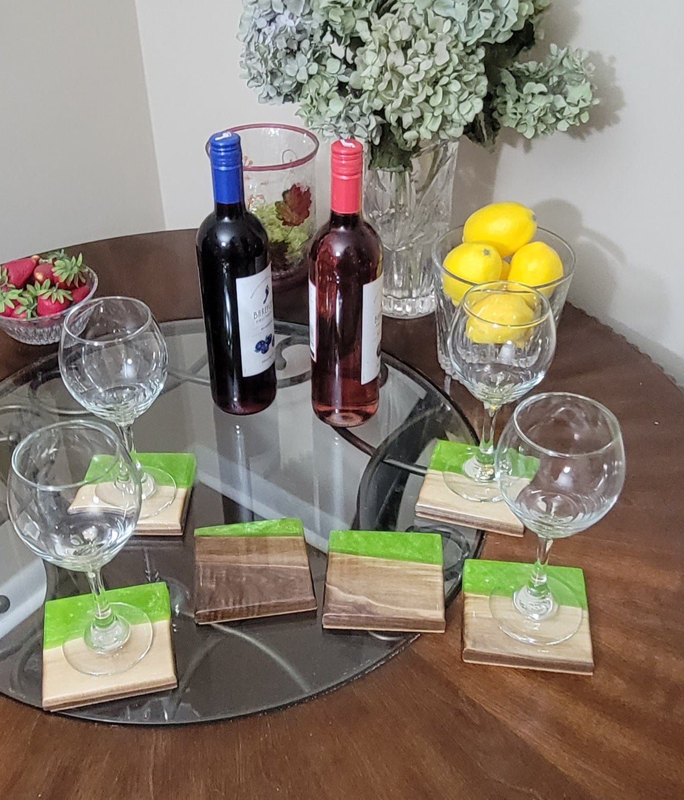 Bring a touch of artisanal charm to your home with our Lime & Pearl Swirl Black Walnut Coaster Set. Handcrafted with precision and care, each coaster is a work of art, featuring a unique epoxy resin river in lime and pearl swirls that adds a pop of color and sophistication to any surface.