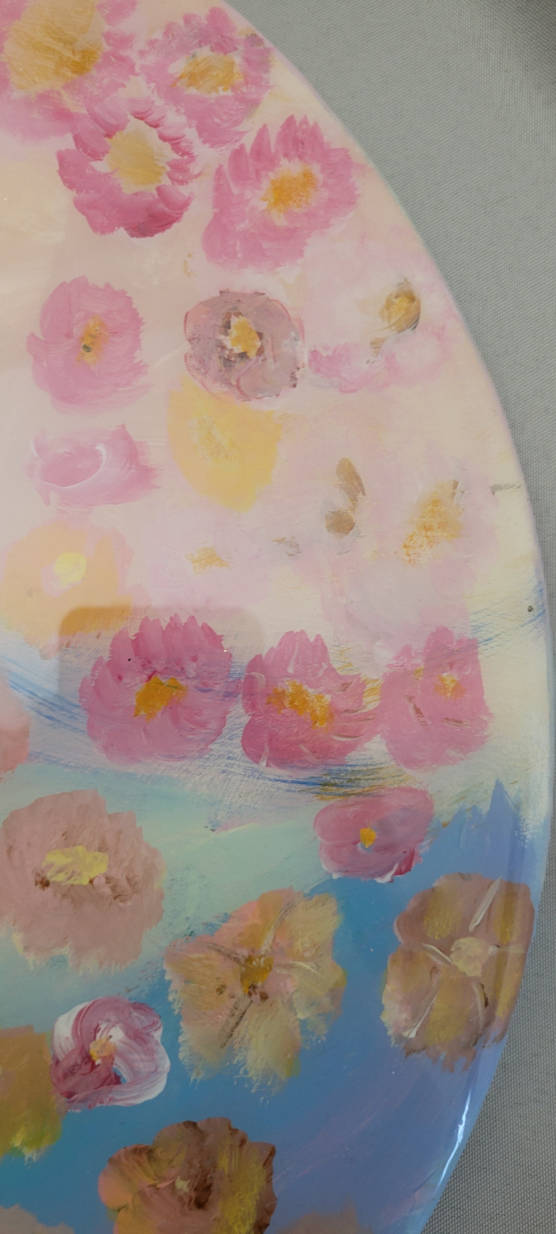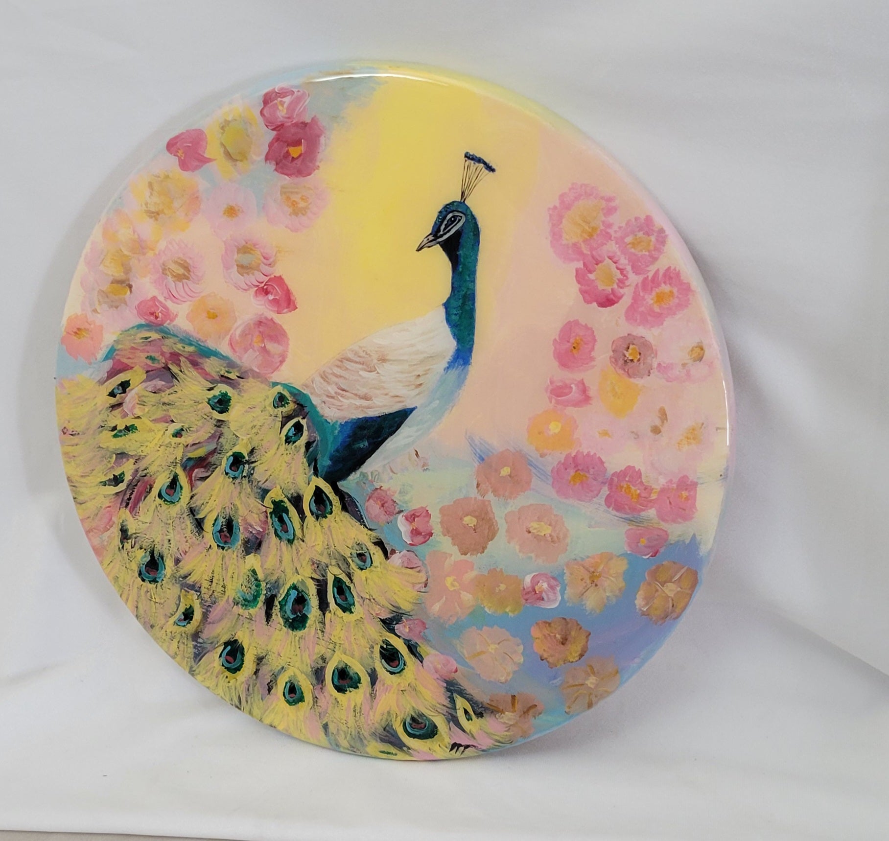 Step into a pastel reverie with this one-of-a-kind piece of wall art, where elegance meets color in the most charming way. Peacock Reverie features a majestic peacock perched proudly among blooming petals, all hand-painted by Niki on a 15-inch birch wood round. The background blushes with warm sunlight tones and gentle florals in soft pinks, buttery yellows, and delicate mauves—creating a dreamy springtime scene that's as romantic as it is regal.