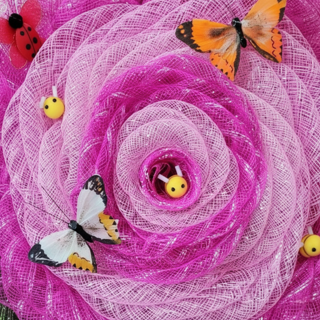 Butterflies, ladybugs, and bees are gently scattered throughout the petals, adding a sense of movement and life — as if the wreath were visited by pollinators drifting through a sunny garden afternoon. Subtle green mesh accents peek through the design, grounding the pink tones and echoing the look of natural foliage.