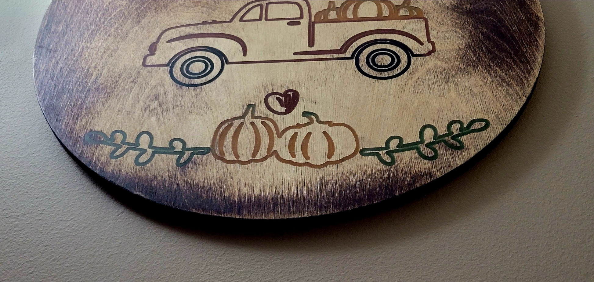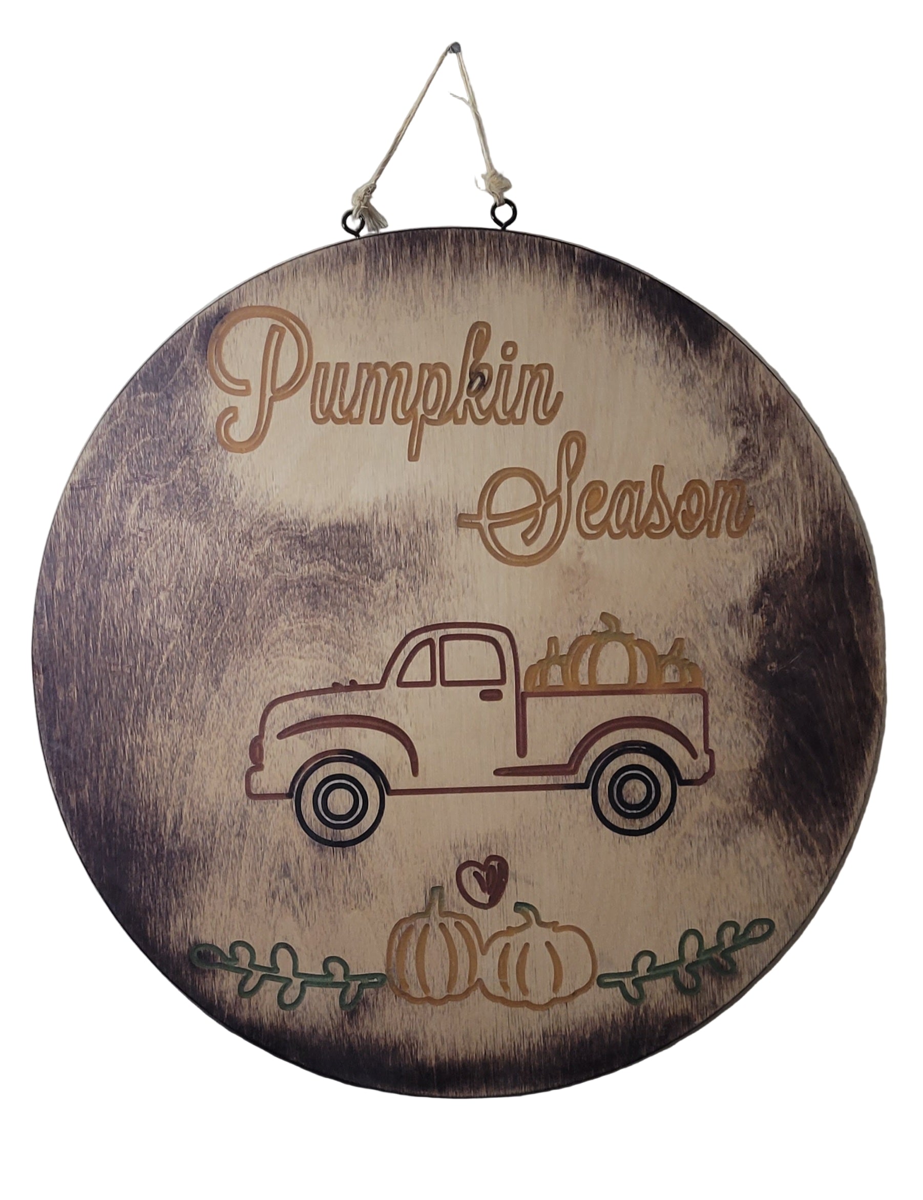 Celebrate the cozy essence of fall with Harvest Haul — a rustic handcrafted wall sign that captures the charm of pumpkin season in timeless farmhouse style. Each 19-inch round is carved from sturdy birch wood, stained in a weathered mahogany finish, and filled with rich epoxy resin hues to accentuate every detail of the vintage farm truck and pumpkin design.