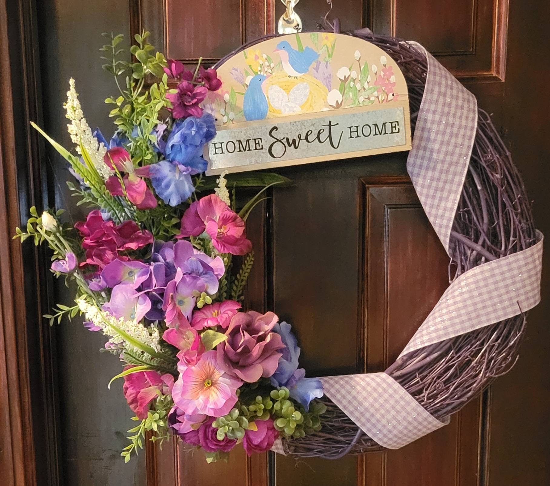 Welcome the season of renewal with Spring Serenade, a handcrafted grapevine wreath that sings with soft color and charm. Measuring approximately 18 inches in diameter, this piece blends delicate spring hues of lilac, plum, and violet with fresh greenery and a gingham ribbon wrap for a look that’s both cheerful and refined. A “Home Sweet Home” sign completes the design, offering a warm welcome for guests or a sweet touch to your everyday décor.