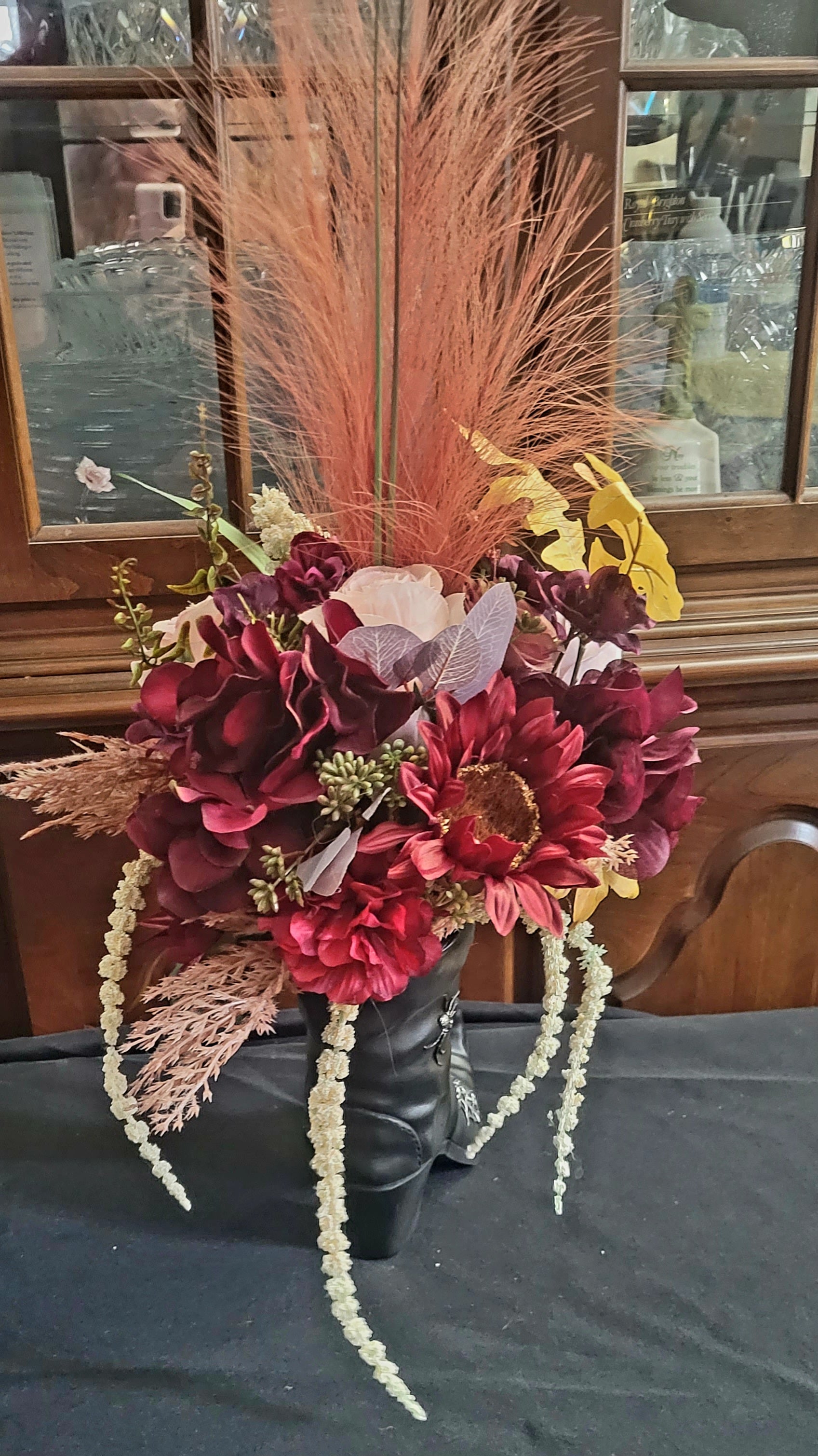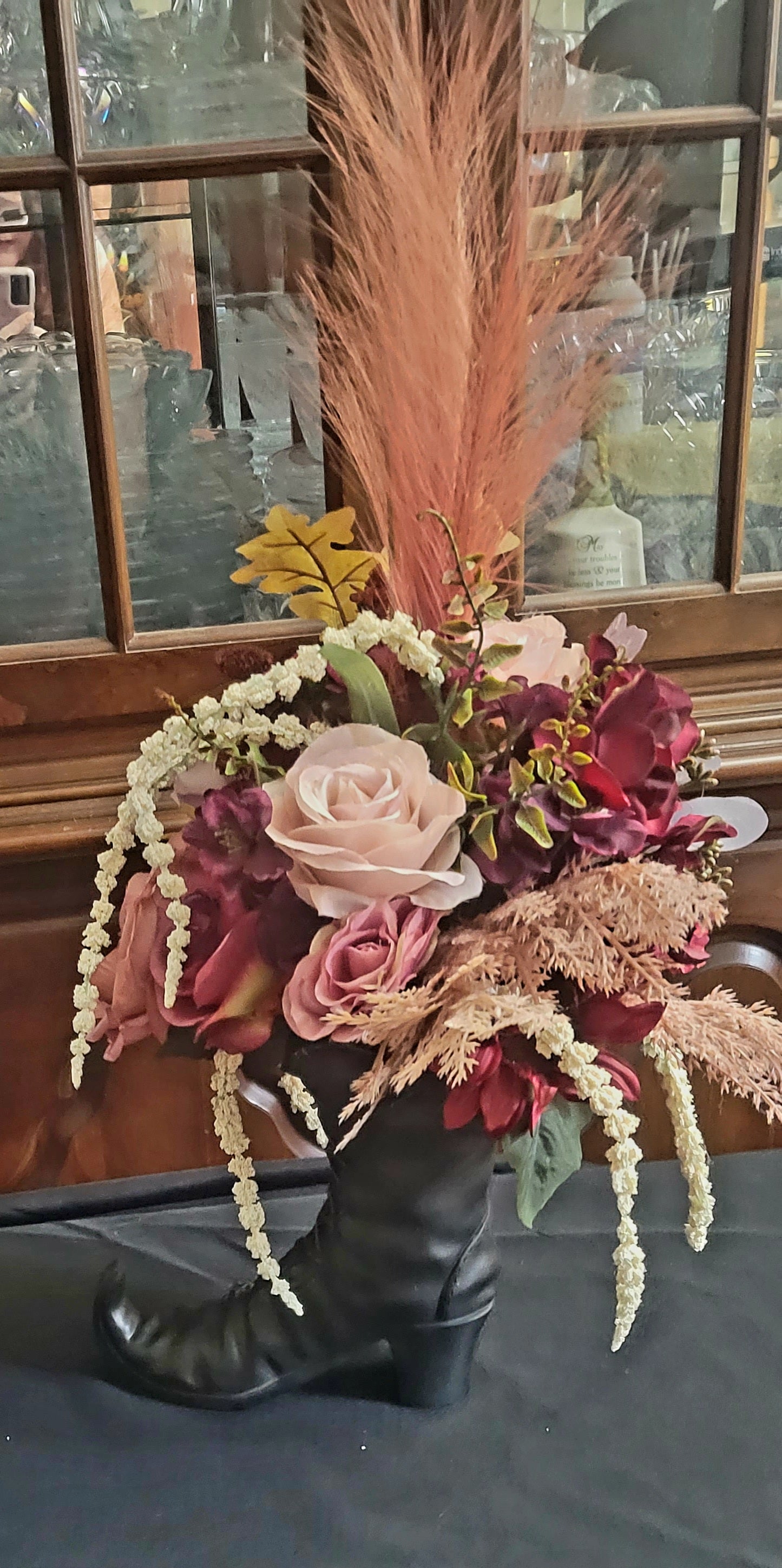 Dimensions: Boot measures 8.5 inches in length, 3.5 inches in width, and 9 inches in height. With the floral arrangement, the height is 20 inches, and the floral width is 12 inches.