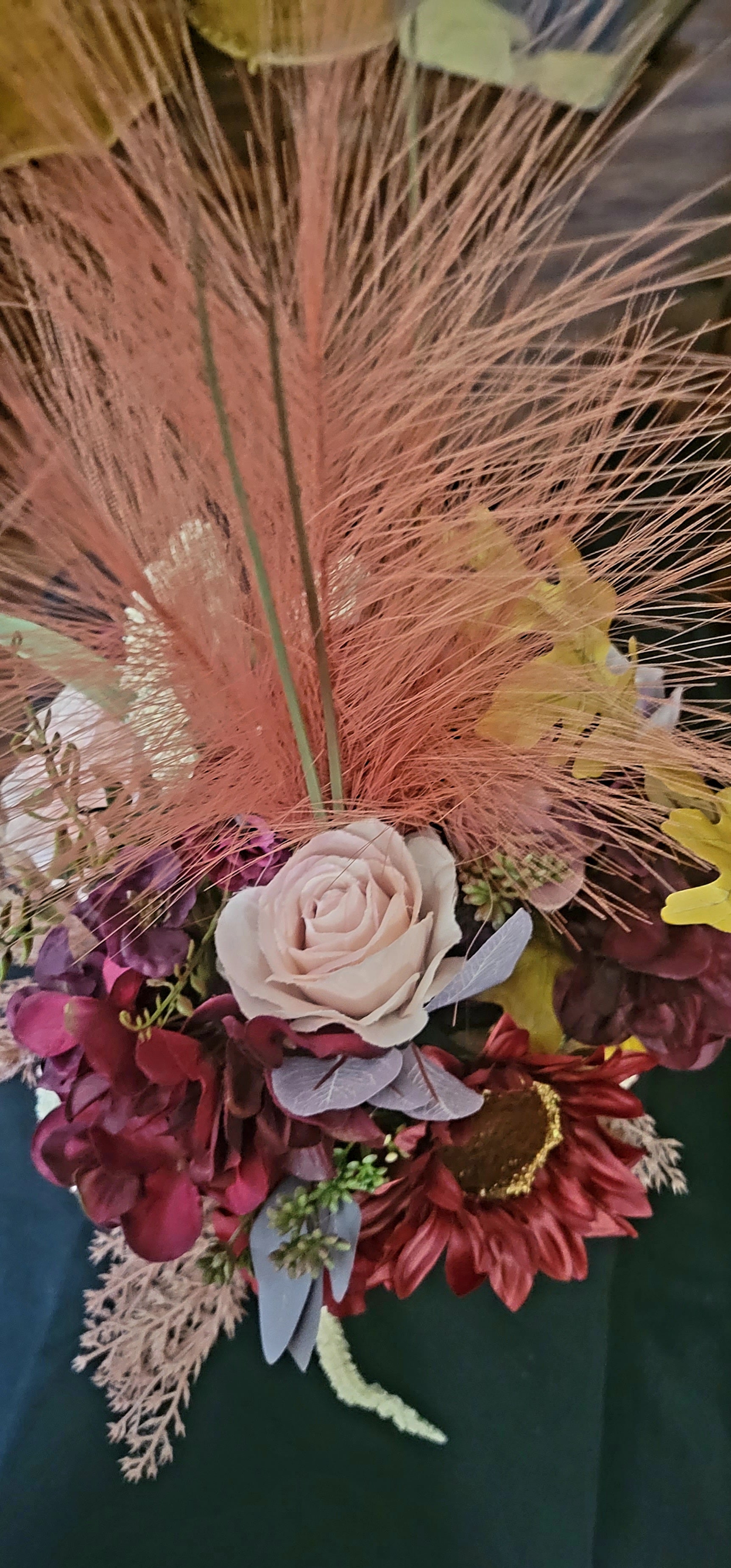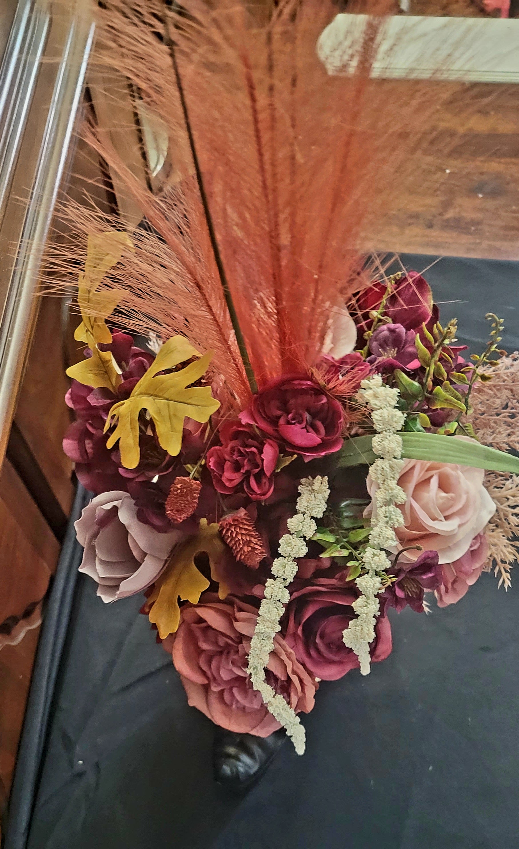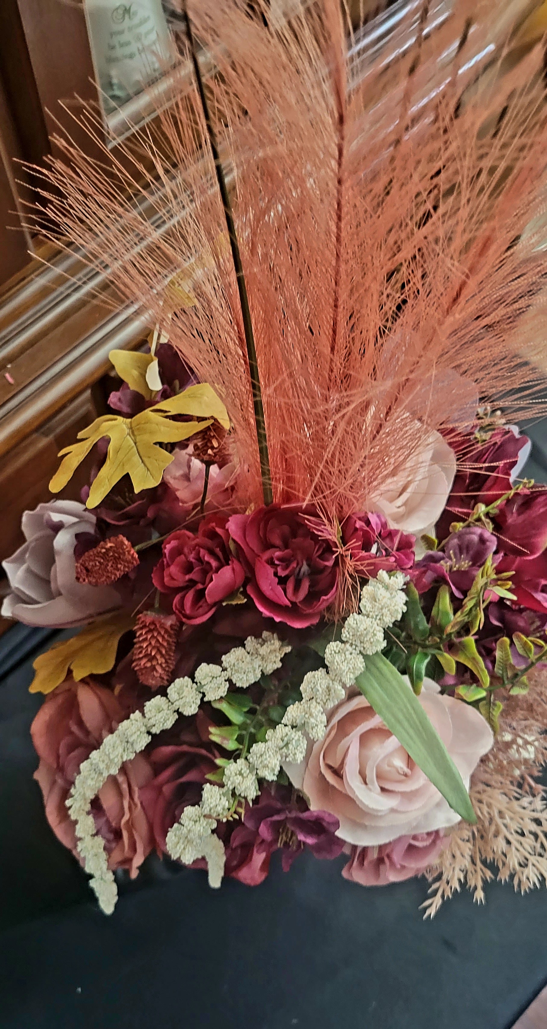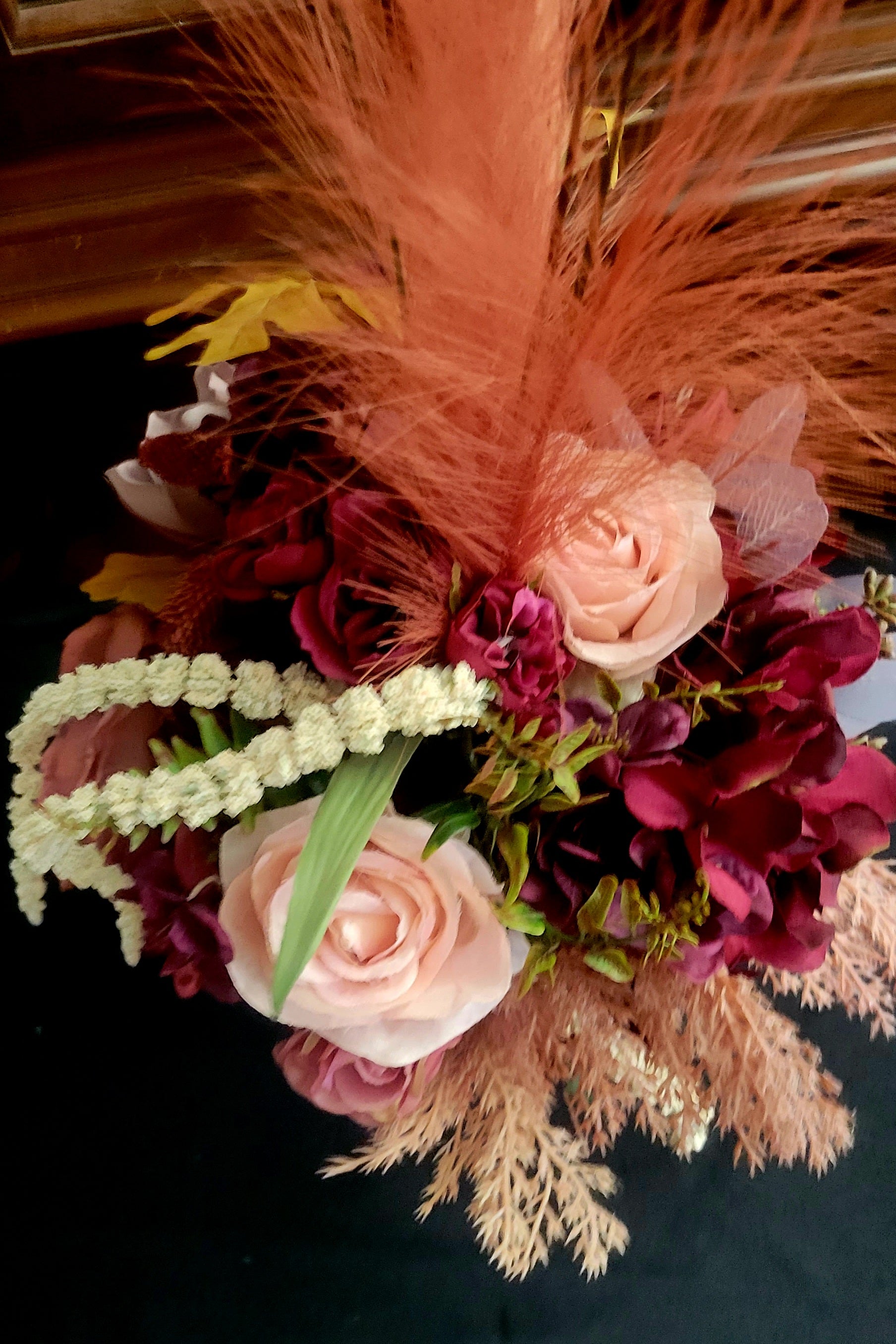 Artistic Arrangement: Features artificial flowers in shades of burgundy, pale pinks, deep reds, and vintage whites.