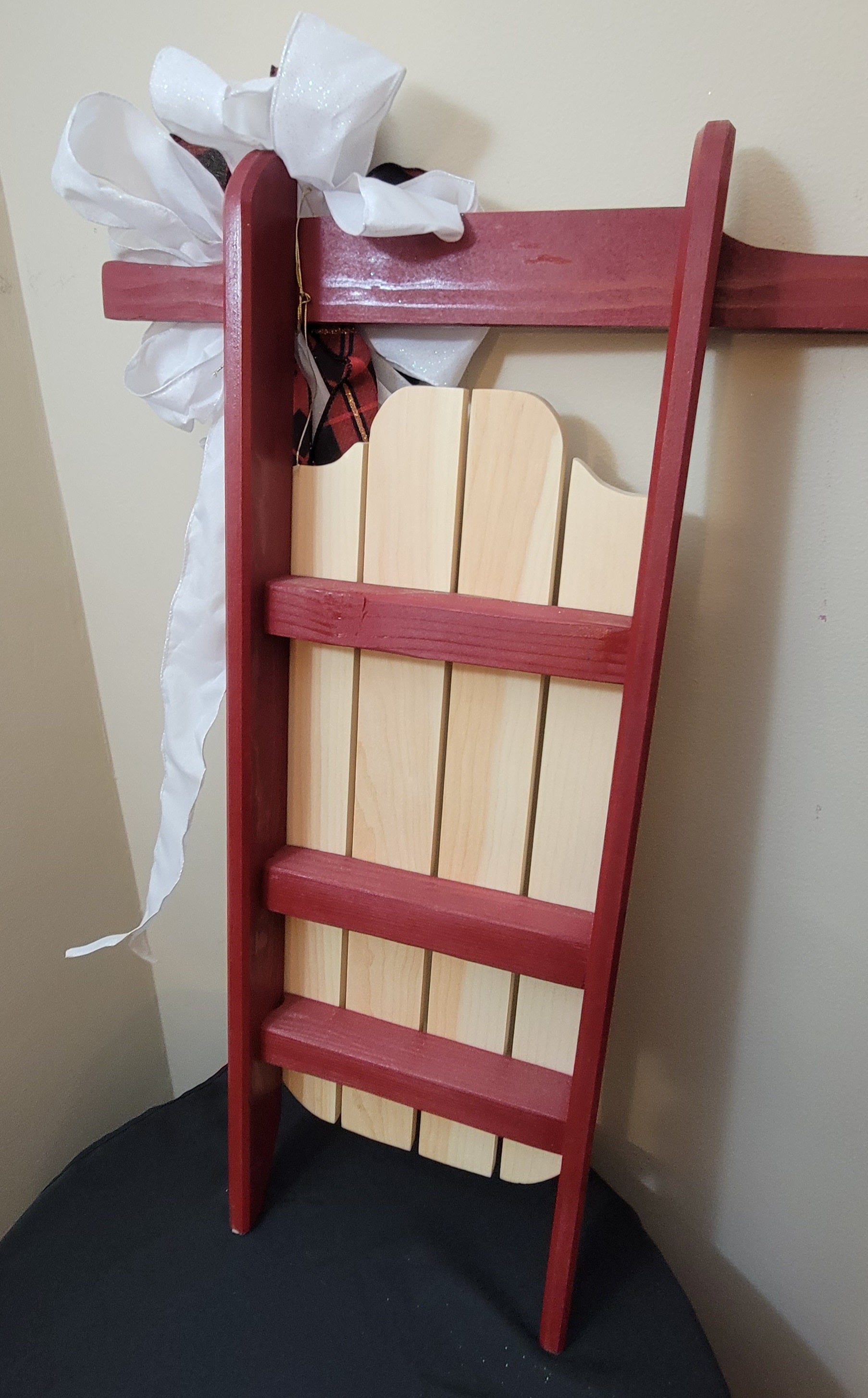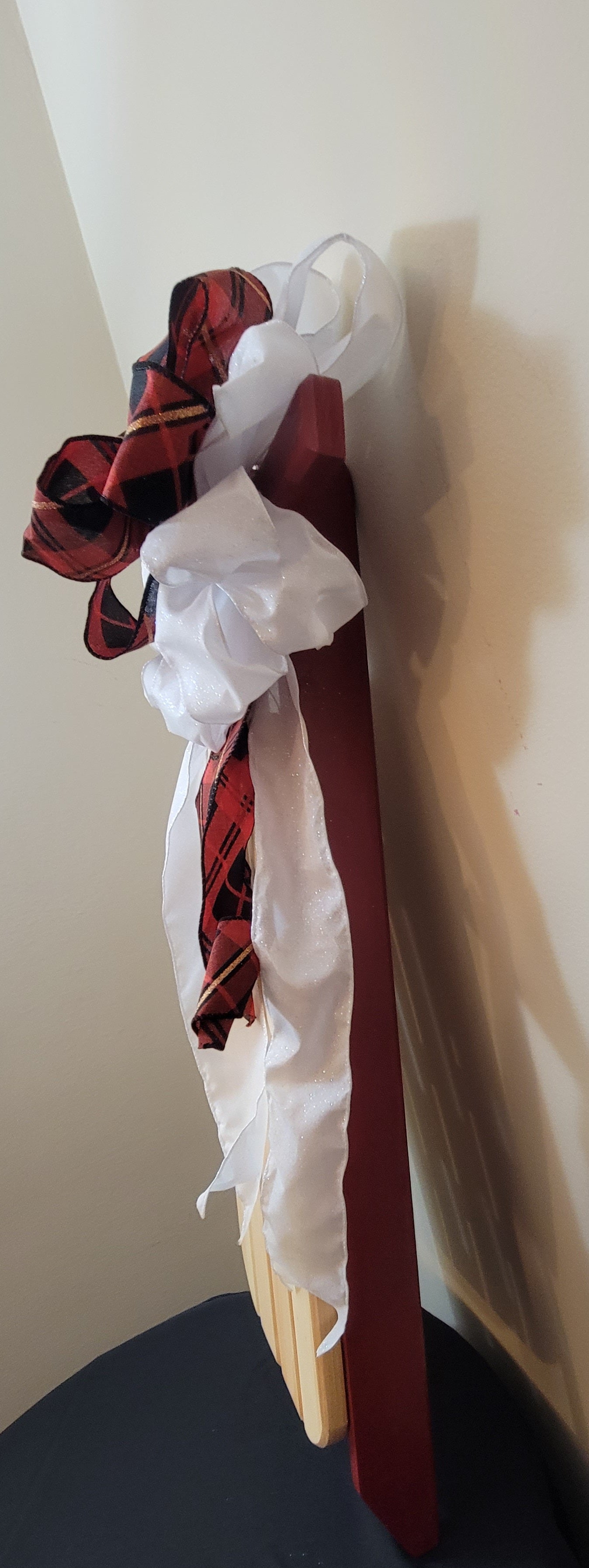 The hand-made bow is a stunning combination of a black and red Christmas plaid ribbon with a shimmering white ribbon, to give this sled that over-the-top look.