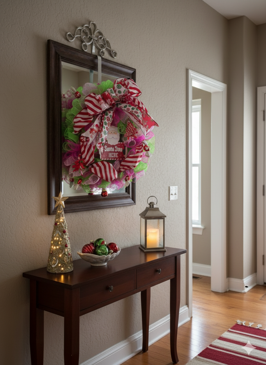 At its center sits a glittery MDF sign reading “Santa Stop Here”—an irresistible invitation for the man in red. Every detail captures the whimsy and warmth of the holidays, making it a perfect statement piece for any door, mantel, or window.