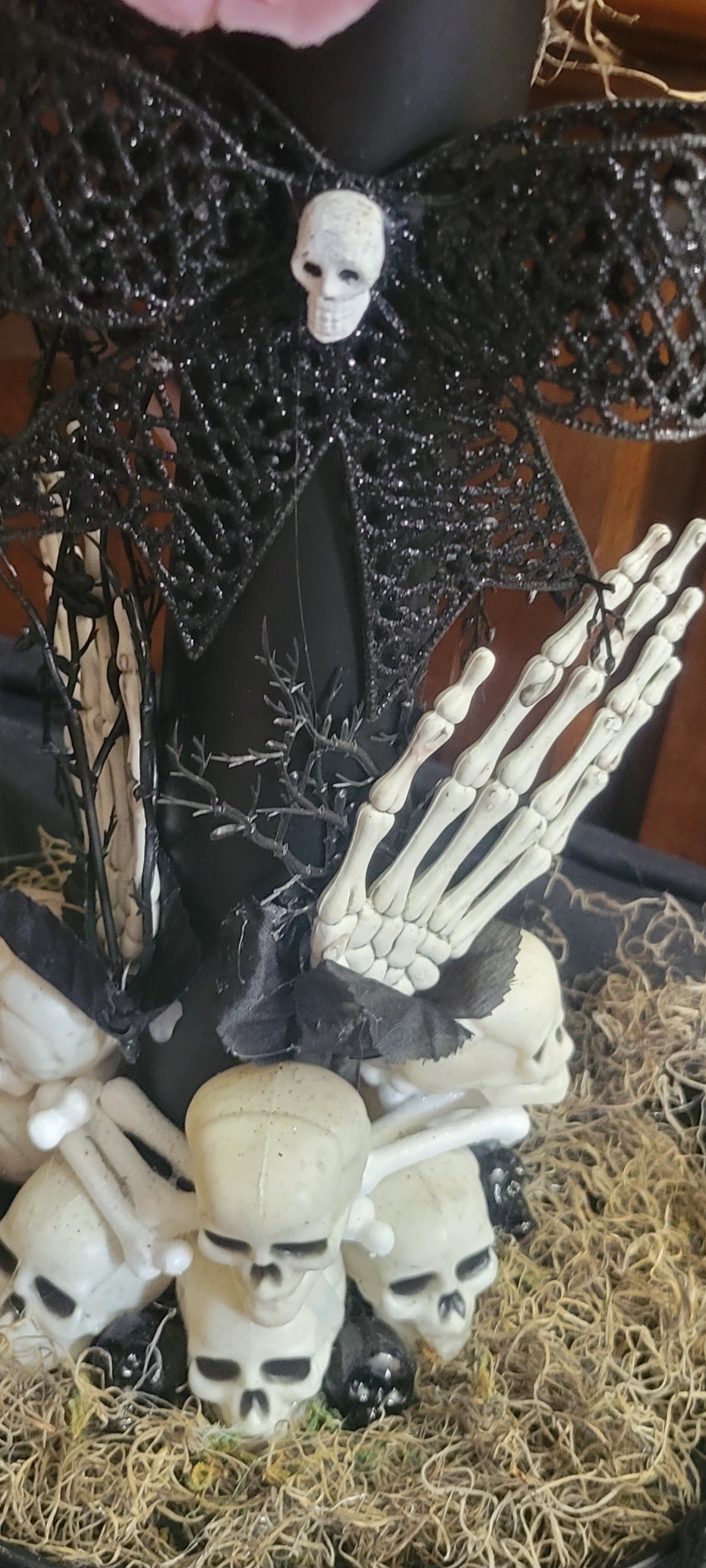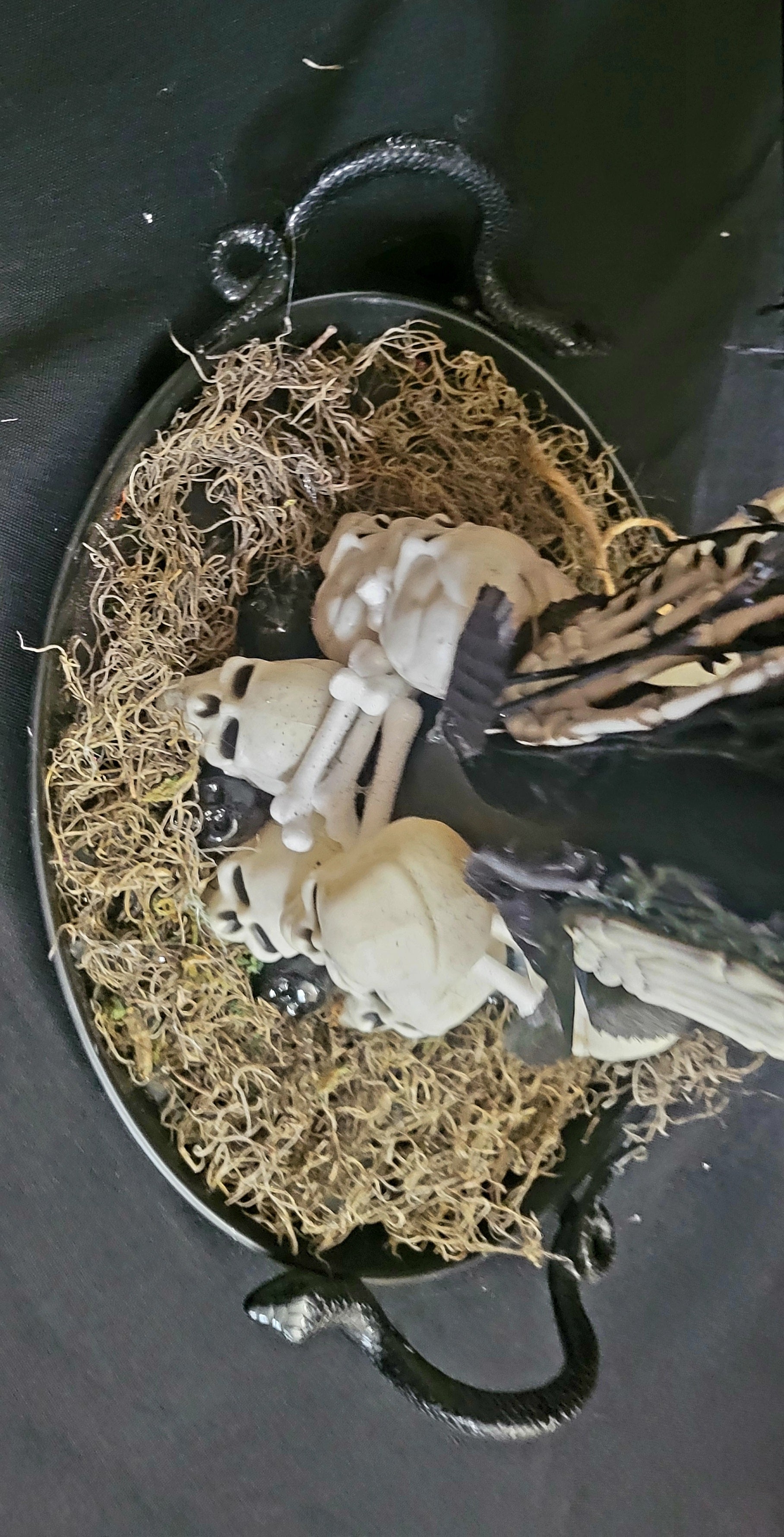 Introducing the Haunting Elegance Spooky Halloween Centerpiece, a sinister yet stunning decorative piece that perfectly encapsulates the mysterious allure of Halloween. Resting on a metal tray adorned with intricately designed snake handles, this centerpiece is a beautiful contradiction of elegance and creepiness. The metal tray, symbolizing strength and durability, is covered in creepy moss, laying down a bed of eeriness. It is further embellished with meticulously crafted skulls, setting a chilling backdrop for the blooming roses. The black vase, poised at the center, is brimming with a combination of black and red roses, symbolizing mystery and passion, respectively. The juxtaposition of the sinister base and the vibrant bloom creates a visually striking contrast, making it a unique addition to your Halloween decor. Whether gracing your dining table or adding a touch of spooky elegance to your mantel, this centerpiece is bound to be a conversation starter.