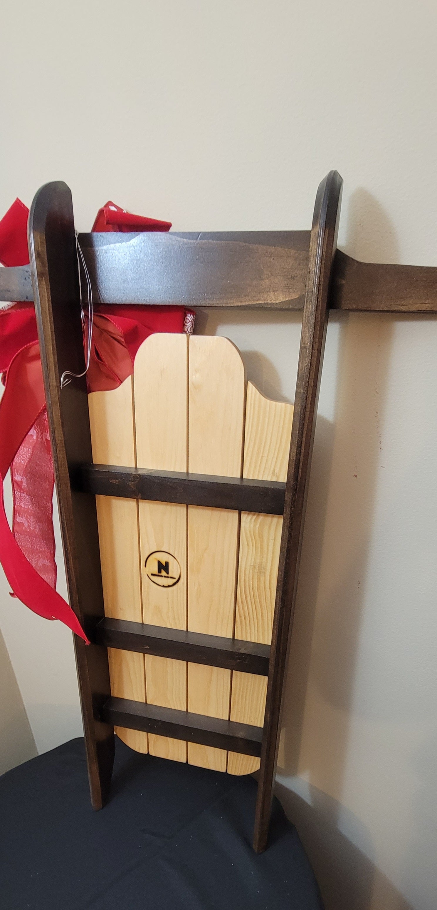 Snowy Lodge – Handmade 32” Wooden Christmas Sled Décor with Scandinavian Ribbon