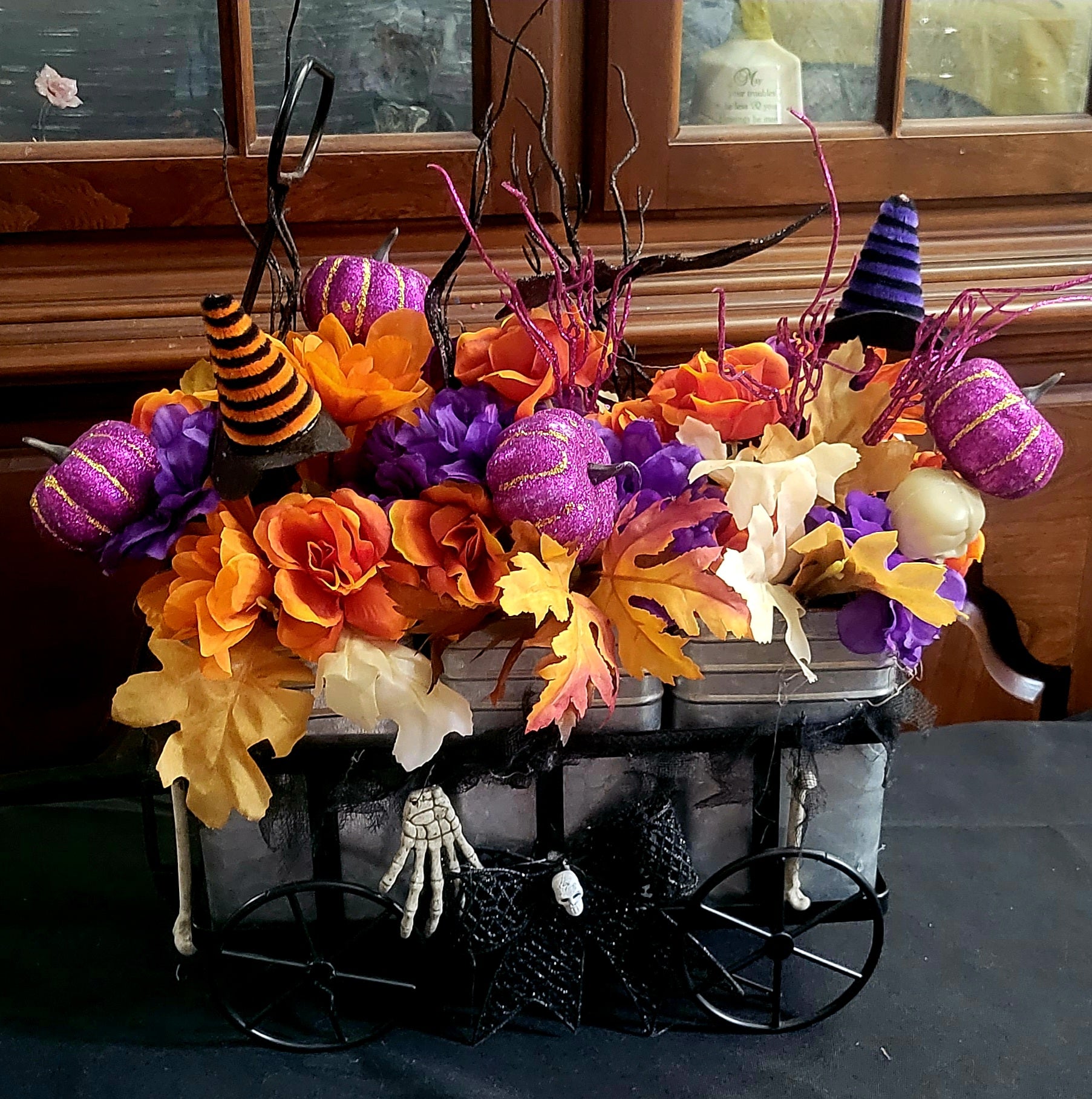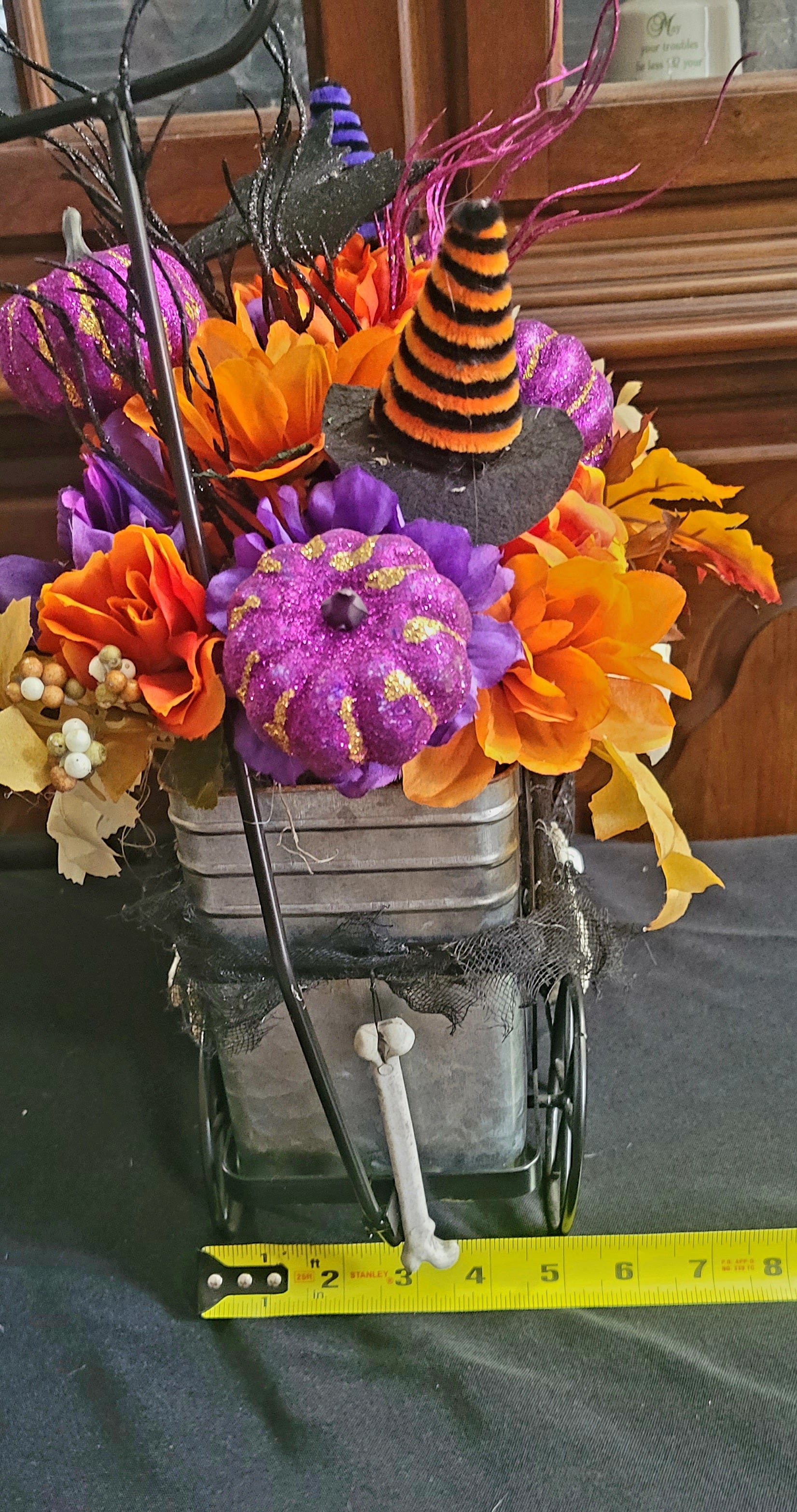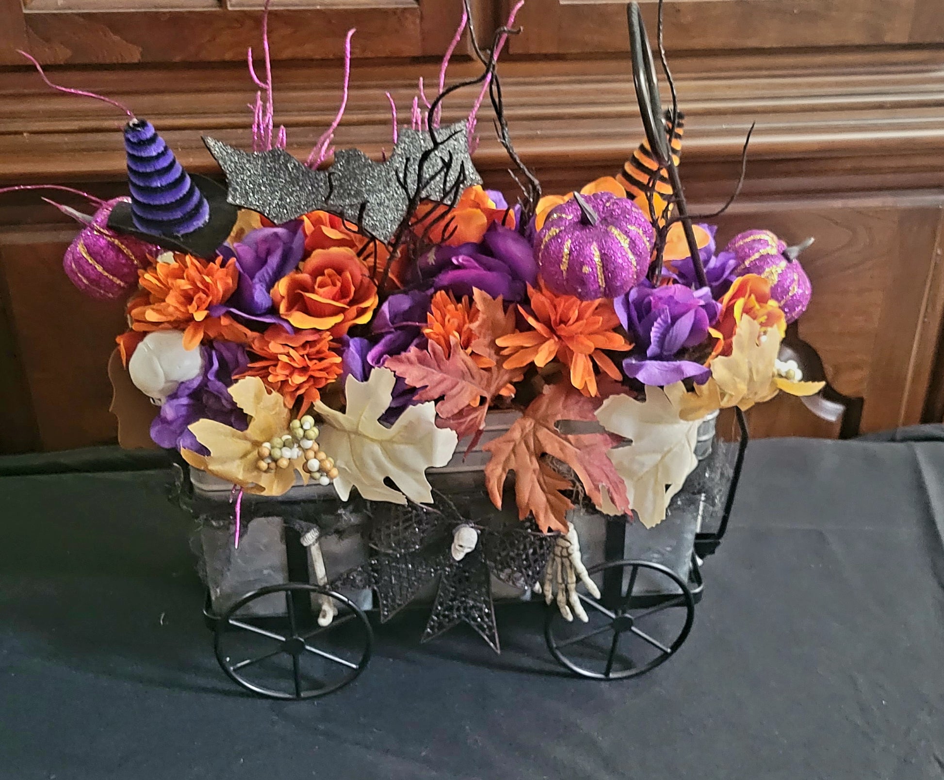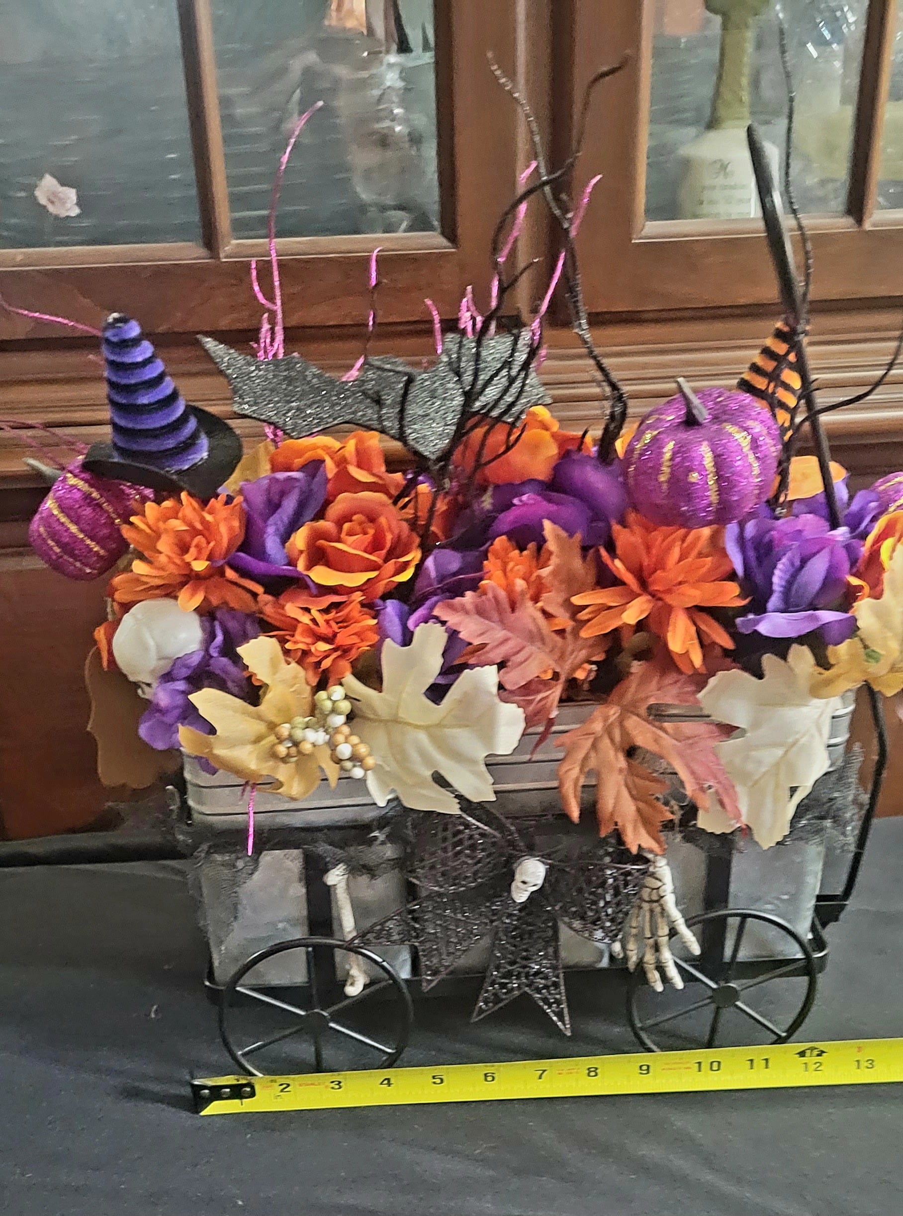 Spooky Harvest Wagon: Fall Florals & Halloween Decor Centerpiece Embrace the festive spirit with our Spooky Elegance Harvest Wagon Centerpiece, meticulously designed to bring together the magic of autumn and the thrilling vibes of Halloween. Constructed with black trick and silver metal, the wagon promises durability and a timeless rustic appeal, making it a standout piece in your holiday collection. Measuring 12 inches in length, 5 inches in width, and standing grand at 17 inches with the handle and florals, this centerpiece is compact yet attention-grabbing. The wagon is abundantly loaded with vibrant artificial fall florals, capturing the essence of autumn’s beauty, while the pumpkins and a mischievous bat add a playful Halloween touch. To elevate the spooky charm, the wagon is adorned with a garland of bones and skulls, making it a perfect conversation starter. Whether placed on a dining table, mantel, or entryway, this harvest wagon centerpiece is sure to turn heads and bring festive cheer to your space.