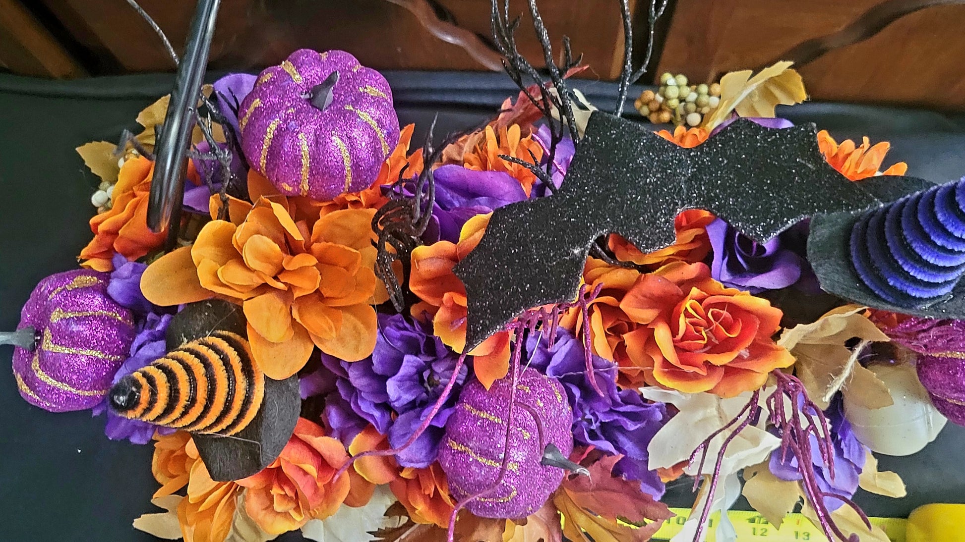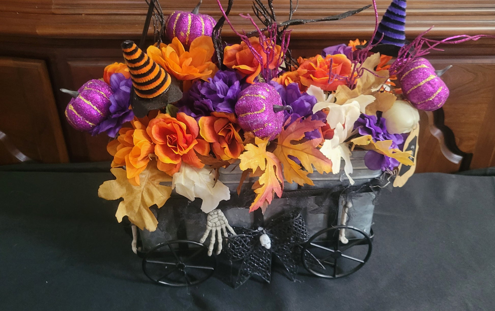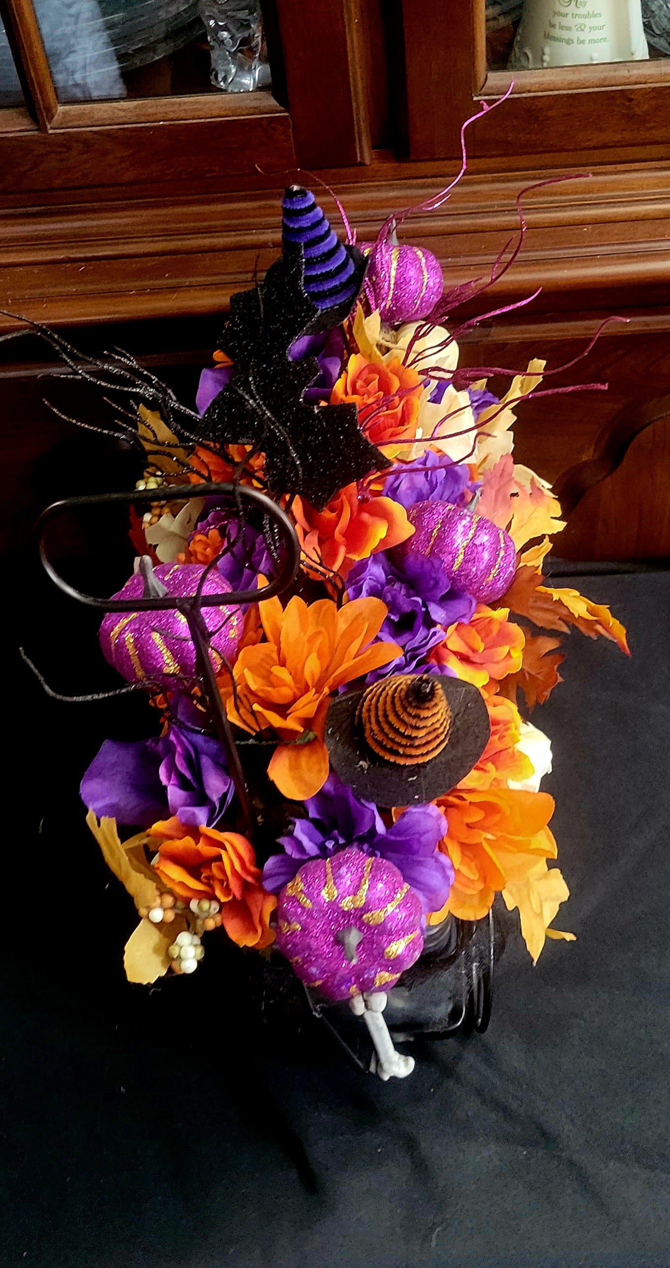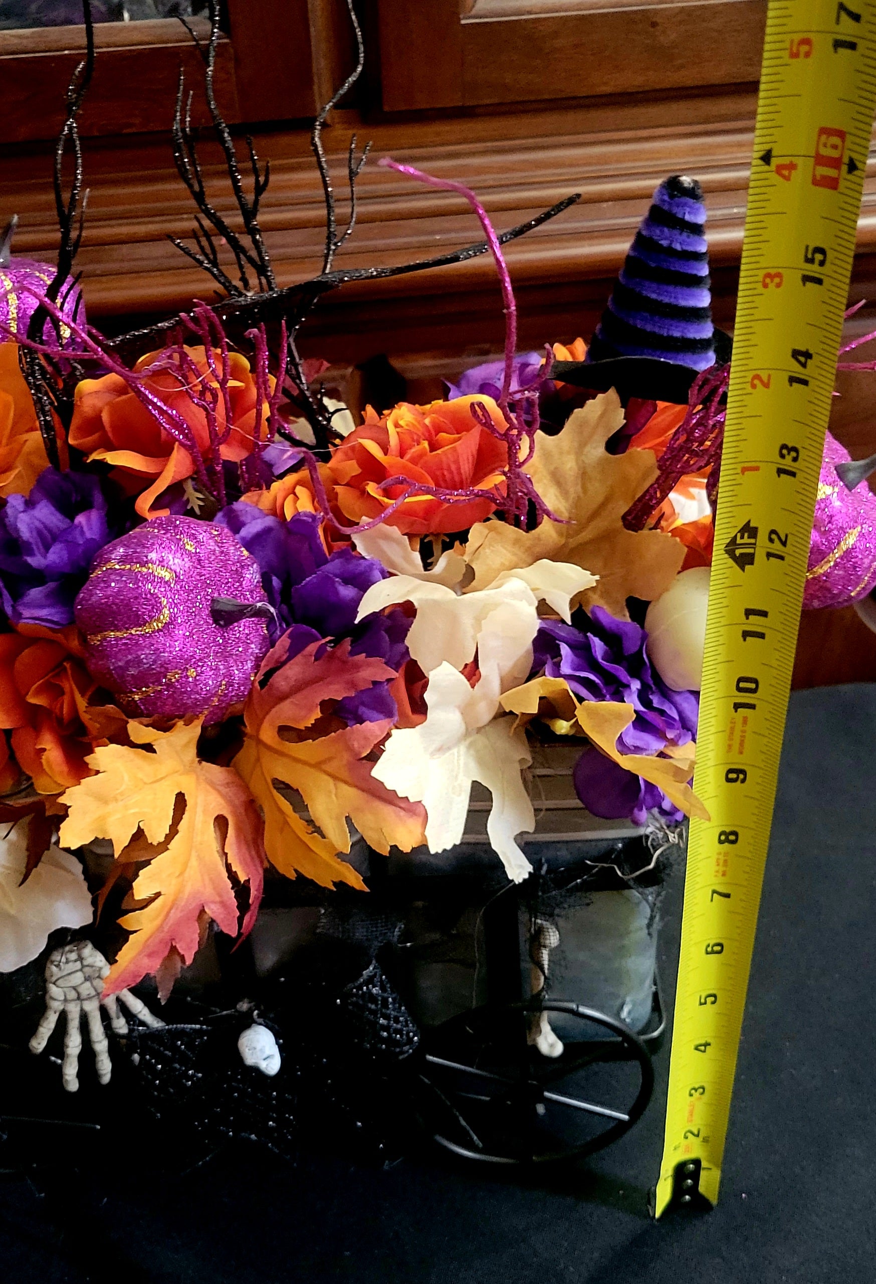 Spooky Harvest Wagon: Fall Florals & Halloween Decor Centerpiece Embrace the festive spirit with our Spooky Elegance Harvest Wagon Centerpiece, meticulously designed to bring together the magic of autumn and the thrilling vibes of Halloween. Constructed with black trick and silver metal, the wagon promises durability and a timeless rustic appeal, making it a standout piece in your holiday collection. Measuring 12 inches in length, 5 inches in width, and standing grand at 17 inches with the handle and florals, this centerpiece is compact yet attention-grabbing. The wagon is abundantly loaded with vibrant artificial fall florals, capturing the essence of autumn’s beauty, while the pumpkins and a mischievous bat add a playful Halloween touch. To elevate the spooky charm, the wagon is adorned with a garland of bones and skulls, making it a perfect conversation starter. Whether placed on a dining table, mantel, or entryway, this harvest wagon centerpiece is sure to turn heads and bring festive cheer to your space.