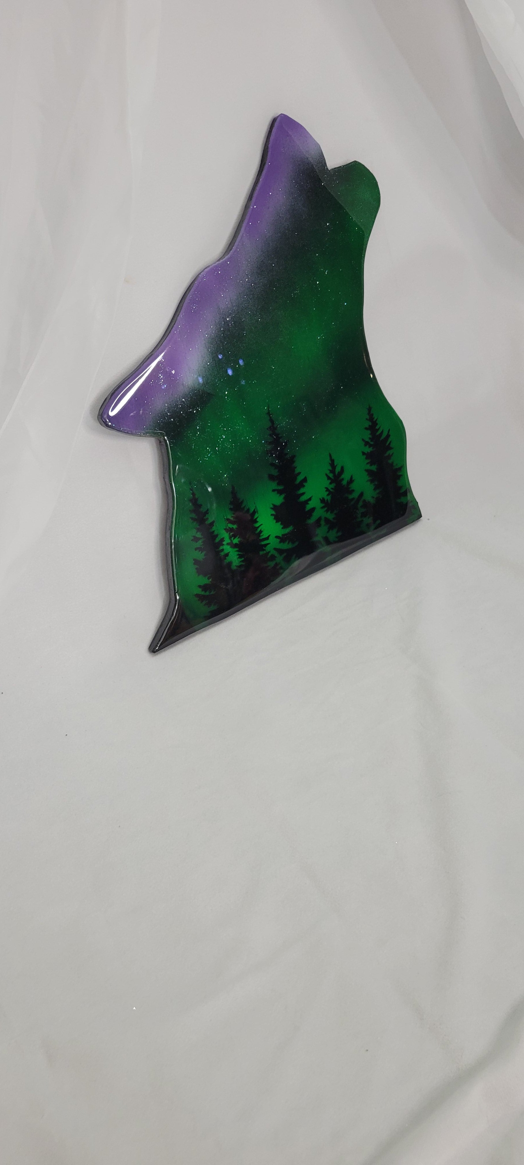 Introducing the “Northern Howl Majesty” wall art piece, where the mysterious beauty of the night sky meets the strength of the wolf’s call. Hand-painted in the ethereal hues of the aurora borealis, this majestic wolf head artwork is a testament to the Northern Lights dancing across the sky. Coated with a glossy, crystal-clear epoxy resin, the vivid greens and purples shimmer with captivating brilliance, embodying the serene yet wild spirit of the great outdoors.