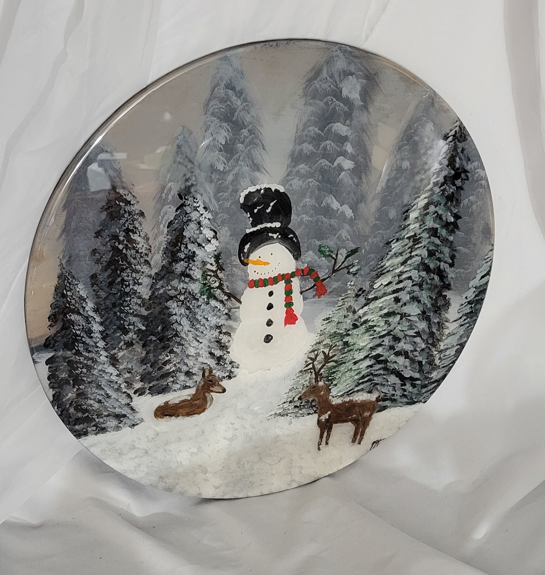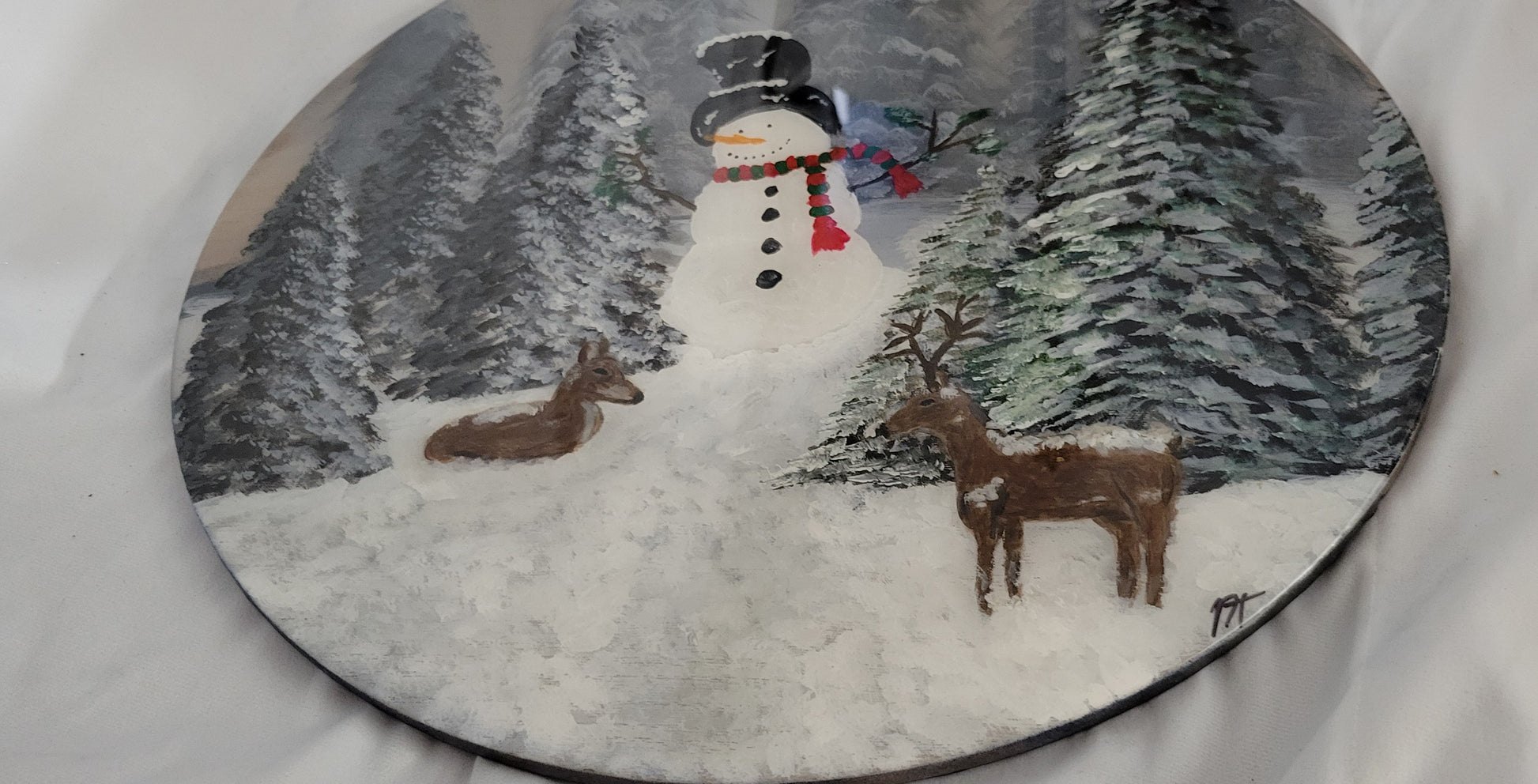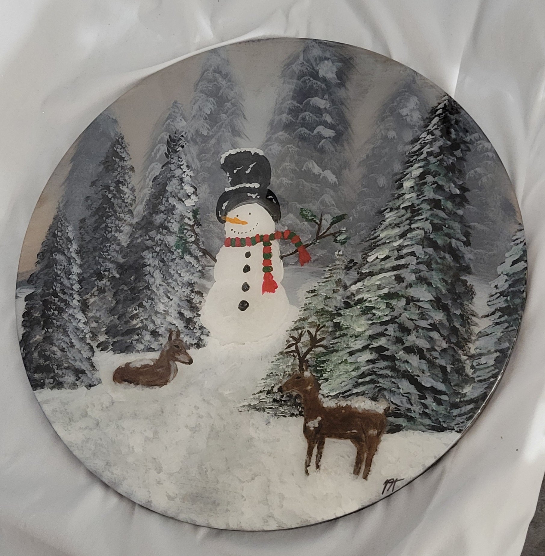 Step into a serene winter wonderland with our “Whimsical Winterland Delight – Handmade” art piece, capturing the magic of a snow-kissed forest scene on a stunning 18-inch round birch wood canvas. This enchanting hand-painted artwork features a friendly snowman adorned with a top hat and a playful red scarf, accompanied by two serene deer in the heart of a majestic, snow-blanketed forest. Crafted with acrylic paints, the piece is beautifully preserved under a glass-like epoxy resin seal and flood coat, giving it a timeless, glossy finish.