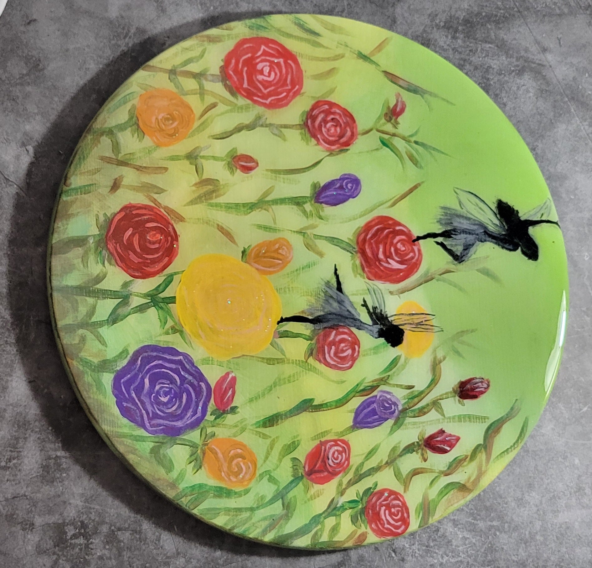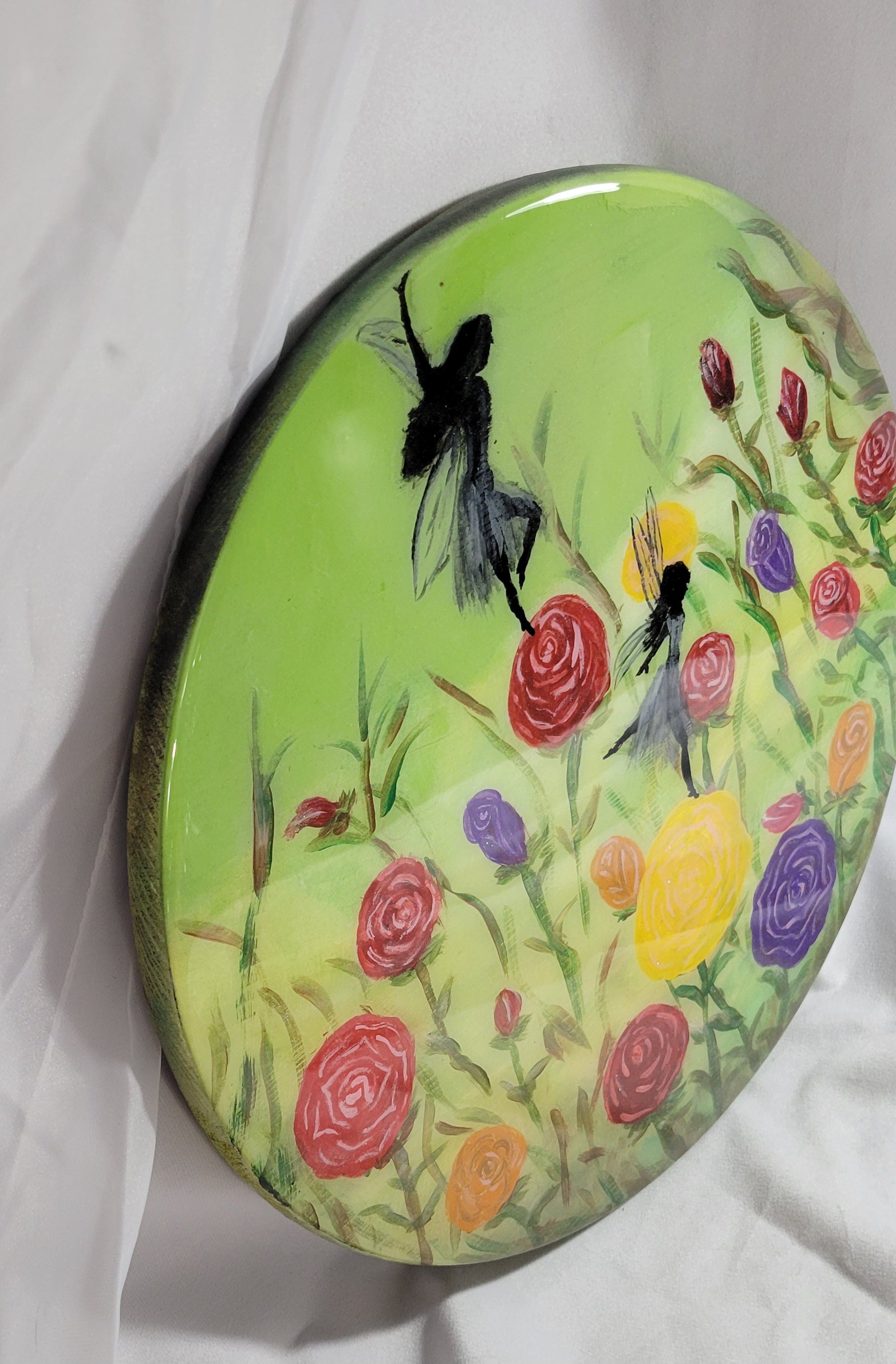 Step into a world of wonder and magic with our Whimsy in Bloom Fairy Garden Wall Art, a stunning masterpiece that brings fairytales to life! Painted by hand on premium birch wood and sealed with a flawless epoxy resin coat, this enchanting 15-inch diameter wall art features playful fairies dancing amidst a vibrant garden of roses in every imaginable hue. Each brushstroke radiates joy, and the epoxy finish provides a glossy, protective shine, ensuring that your fairy garden never loses its sparkle.
