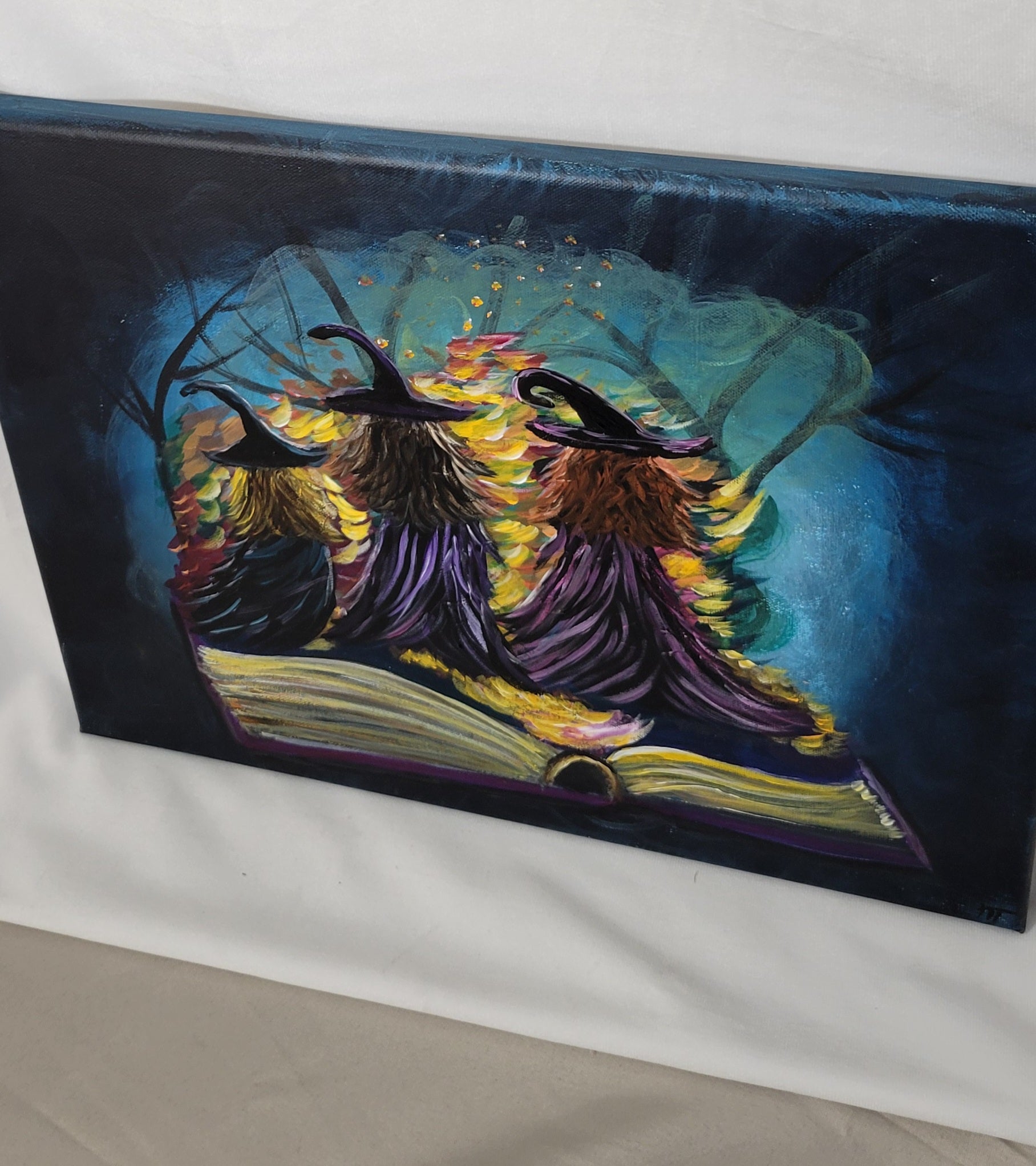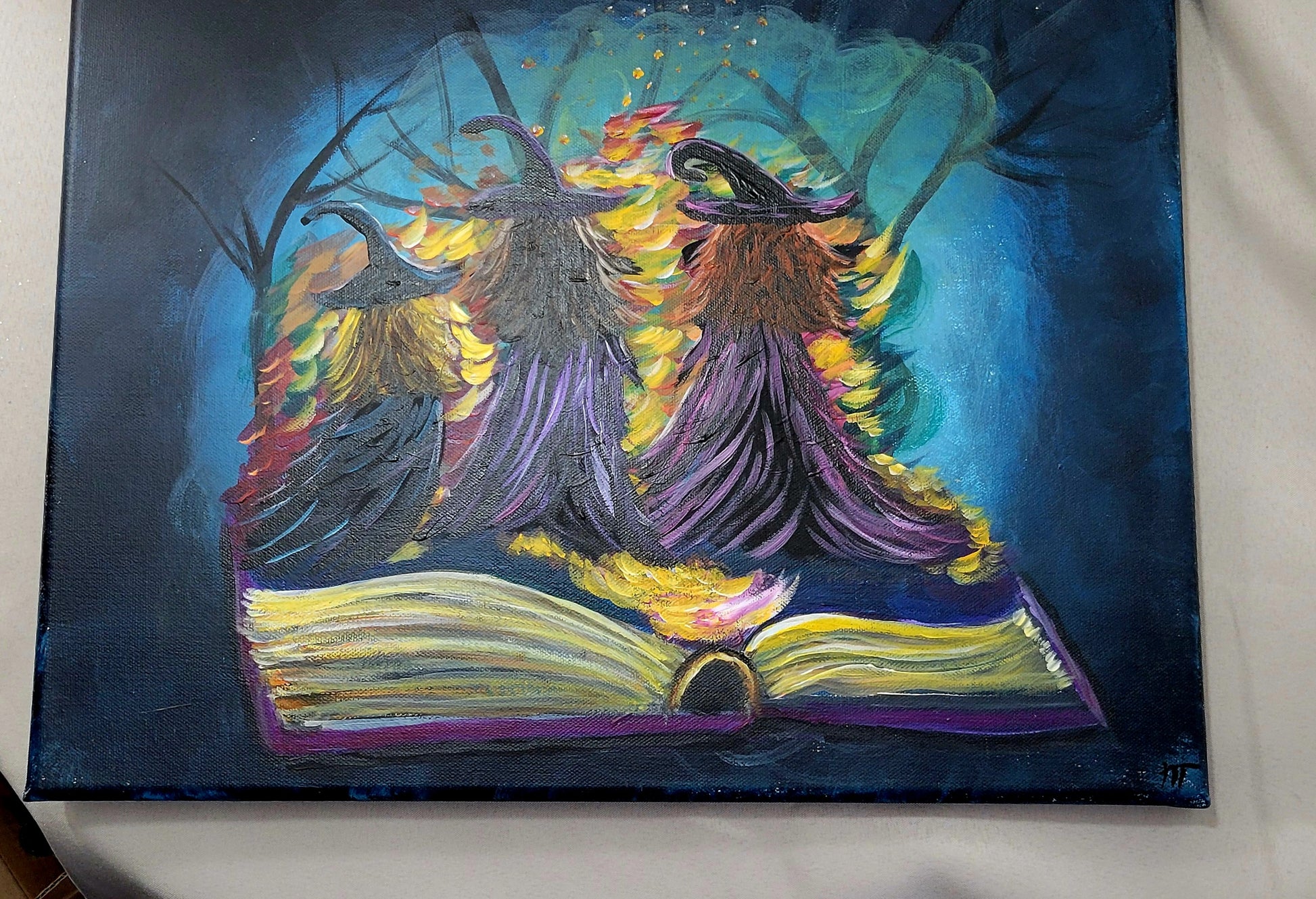 Step into a realm of enchantment where mystery meets moonlight. "Whispers & Witches – A Midnight Gathering Canvas Painting" is an ethereal celebration of storybook sorcery, hand painted by Niki with layers of rich acrylics and imagination. Three cloaked witches rise from an open book, their forms bathed in moonlit blues, spellbound purples, and the embers of an unseen fire. With vivid brushstrokes and glowing movement, they appear almost in motion—as if summoned right from the pages below.