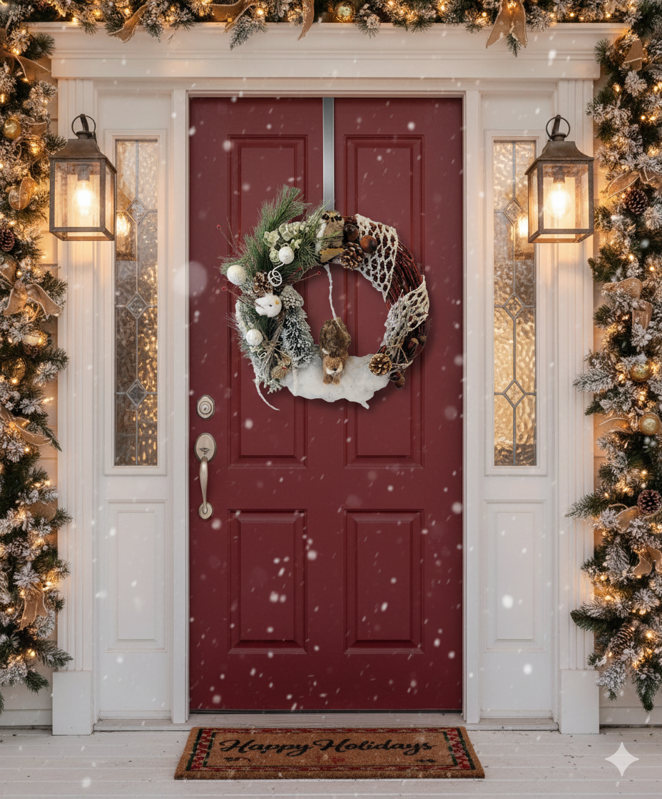 Let winter’s quiet story unfold at your door. The Woodland Whimsy Wreath captures the serene beauty of a snow-dusted forest, all gathered on a cranberry-red grapevine base. Measuring 18 inches in diameter, this piece blends rustic natural texture with a touch of playful woodland magic.