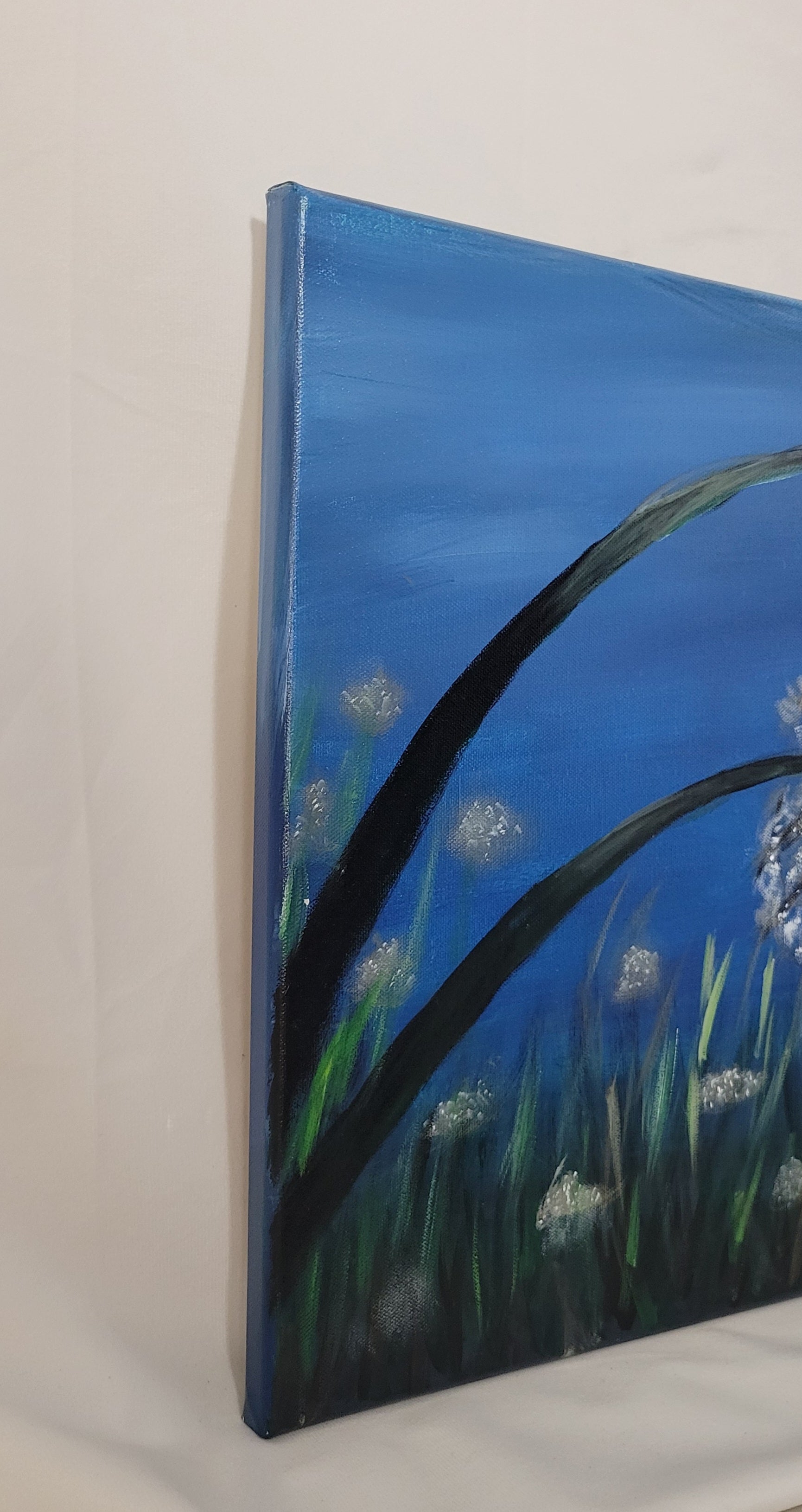 Painted on a 20” x 16” stretched archival cotton canvas, this original artwork features two dandelions in varying states of release, their delicate seeds caught in a sweeping breeze over a deep blue sky. The grounded tones of lush green grass, paired with the soft white tufts of dandelions, offer a moment of stillness—a breath of nature’s poetry for your wall.